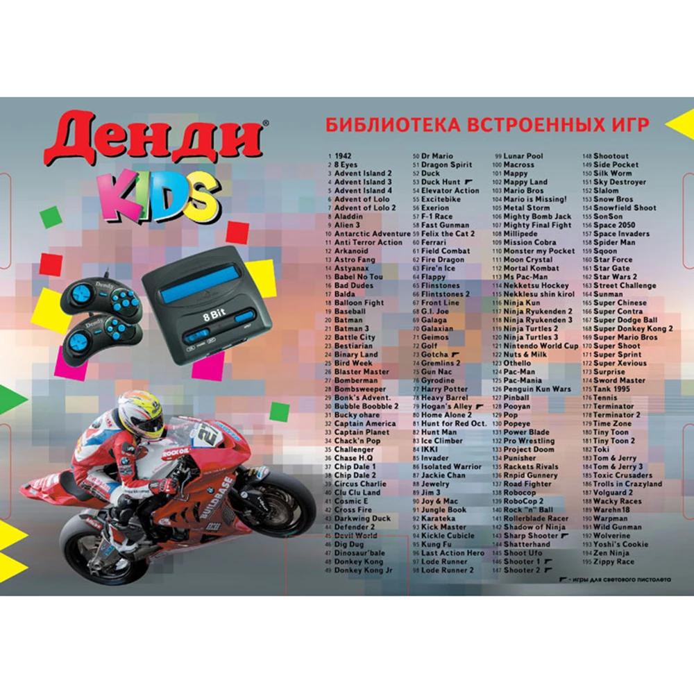 Представляем вашему вниманию обновленную игровую приставку – Dendy Kids. Отличительная особенность – новый корпус,подключение к телевизору через АV-кабель стандарта SEGA, два джойстика и большой сборник 195 игр. Увлекательные, проверенные временем игры, позволят приобщиться к яркому и красочному миру восьмибитных игр.