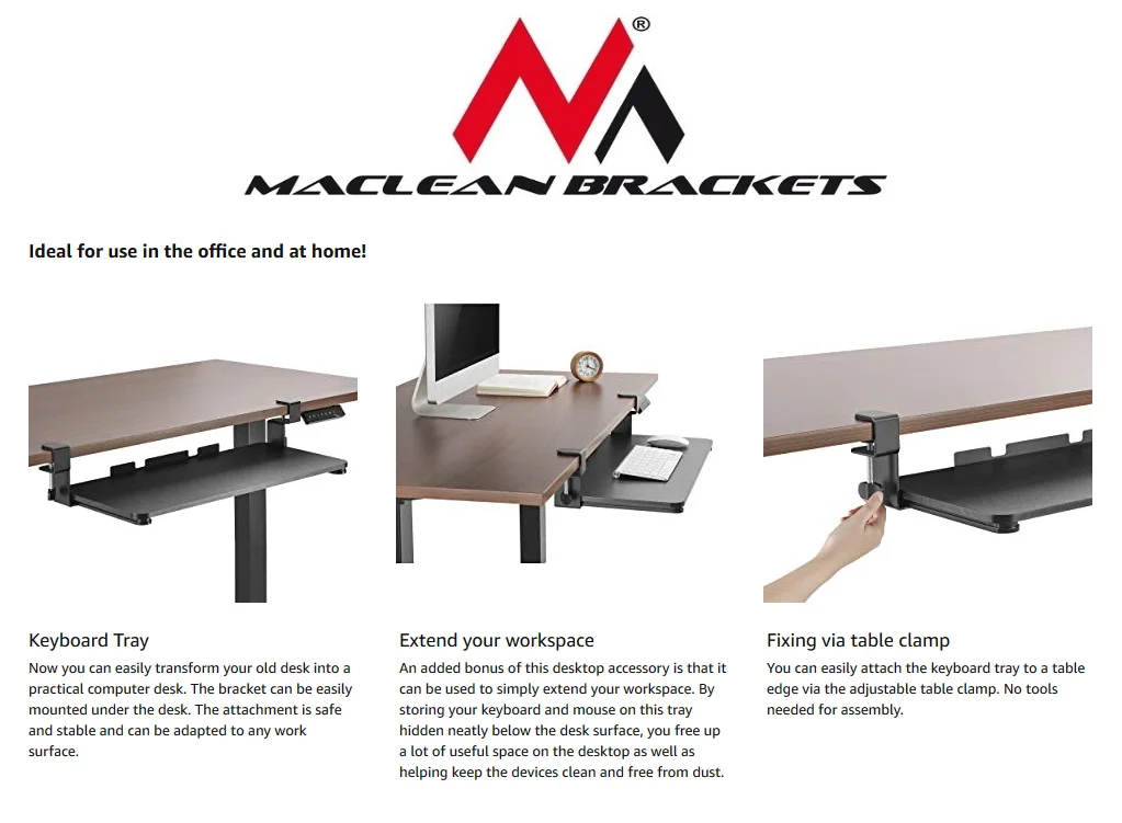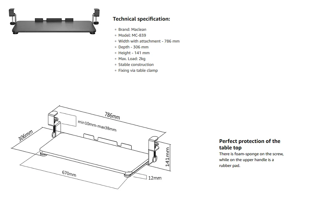 Качественная конструкция, построенная на последующем: MC-839 имеет два крепких стальных зажима, которые надежно удерживают край стола и отлично поддерживают лоток для клавиатуры. Зажимы были выбраны таким образом, чтобы настроить опору было легко для кого-либо сделать, а также избежать повреждения стола с помощью винтов и отверстий. Сам лоток для клавиатуры изготовлен из прочных материалов с гладкой черной отделкой. Задняя часть лотка для клавиатуры имеет защиту, предотвращающую скольжение клавиатуры с задней стороны.