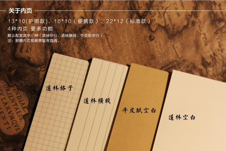 Внутренние страницы имеют 4 стиля: сетка, пустая коричневая бумага, белая пустая, горизонтальная линия, при заказе необходимо оставить сообщение.
