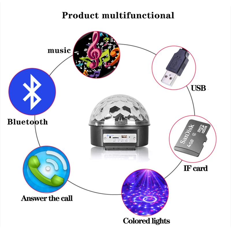 2. Светодиодный Кристальный сценический светильник Bluetooth-наш превосходный светодиодный вращающийся праздничный светильник позволяет наслаждаться музыкой в режиме USB, режиме Bluetooth и режиме USB-диска. Этот волшебный шар точно поможет вам встряхнуть глаза яркими огнями (градиенты, переходы, вода и другие блестящие эффекты, красный, зеленый, синий, белый, желтый, фиолетовый) и почувствовать себя прохладным.