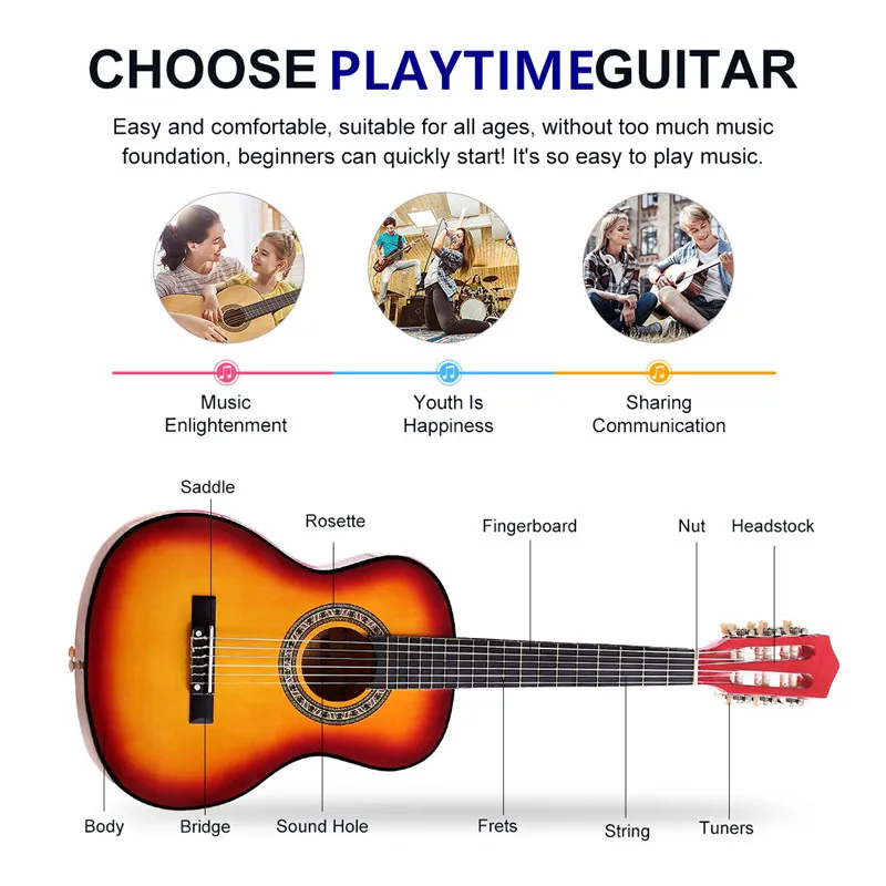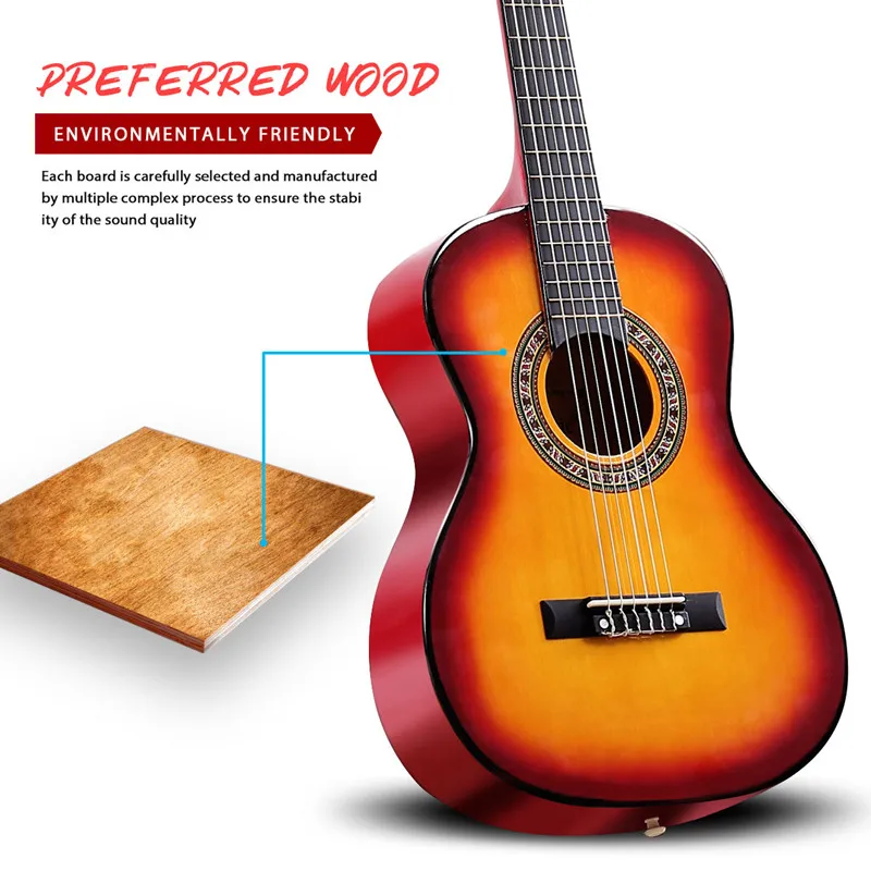 Если вы ищете стильную и прочную гитару для себя или ваших маленьких, эта гитара будет вашим оптимальным выбором. Деревянный корпус, березовый гриф и горловина, высокопрочные нейлоновые струны, все они хорошо соединены, что делает их надежными и удобными стартовыми гитарами. Прочный музыкальный инструмент поддерживает вас, чтобы придерживаться своего хобби и идти в ногу с вашими растущими навыками и опытом. Дополнительные аксессуары, такие как тюнер, выбор, струны и капо, предоставляются, чтобы помочь вам создавать красивые песни и стать чем-то виртуальным. Отделка из натурального дерева идеально подходит для начинающих, как промежуточных, так и продвинутых игроков.