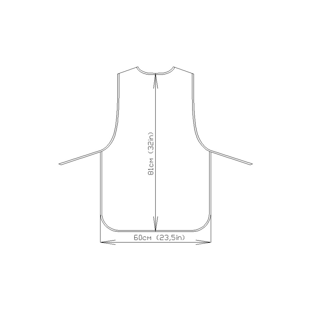 Фартук средней длины, перекидной, имеющий спинку без отделки и полочку с отрезными симметричными кокетками, нижний слой которых выполнен из отделочной ткани. В нижней центральной части полочки расположен вместительный карман с двумя отделениями, декорированный планкой из отделочной ткани. Объем фартука регулируется завязками-поясами, все срезы фартука обработаны кантом из капроновой ткани. Фартук предназначен для защиты от общепроизводственных загрязнений.