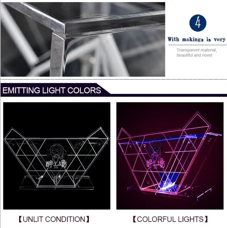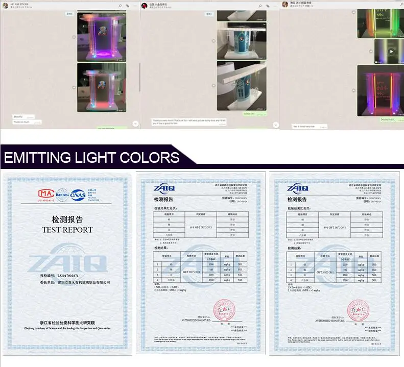 Код товара TN-D042 Материал Акрил/PMMA/Lucite Цвет Прозрачный, красный, темно-синий, светло-голубой, фиолетовый, зеленый, желтый и белый Логотип Используйте различные способы, чтобы сделать в соответствии с вашим логотипом Размеры 100*55*110 см Светодиодный свет Цвета, могут мигать и постепенно меняться, управляются дистанционным управлением Толщина 6-10 мм или по индивидуальному заказу Упаковка Полиэтиленовая упаковка, сотовая картонная доска внутри, картонная коробка Оплата T/T , Western Union
