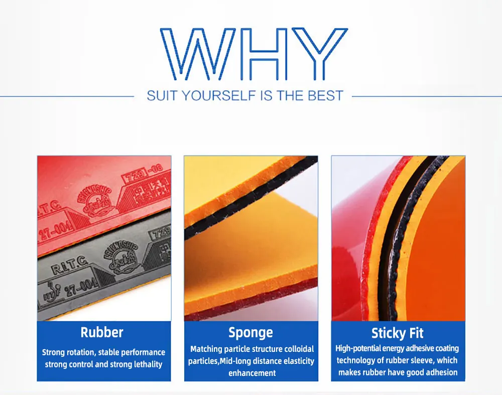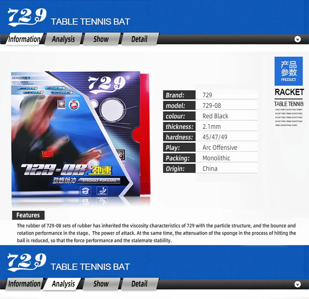 The rubber of 729-08 sets of rubber has inherited the viscosity characteristics of 729 with the particle structure, and the bounce and rotation performance in the stage,The power of attack. At the same time, the attenuation of the sponge in the process of hitting the ball is reduced, so that the force performance and the stalemate stability.