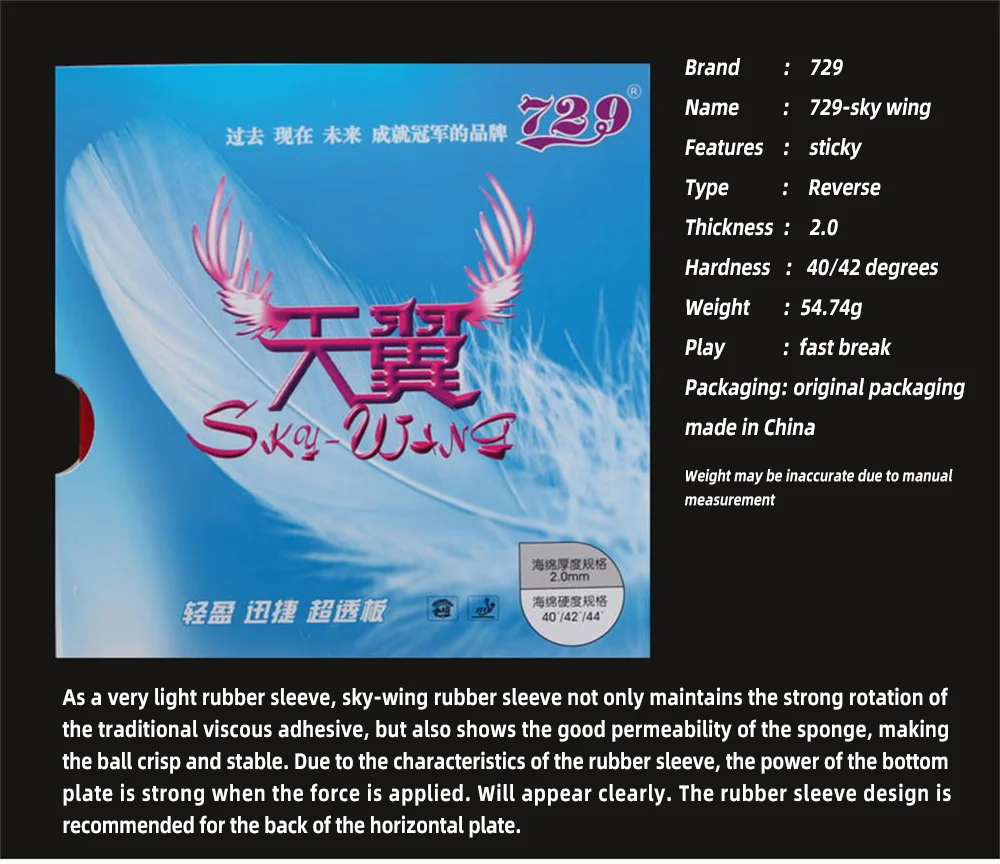 Резиновый рукав-светильник небесно-крылый Резиновый рукав не только поддерживает сильное вращение традиционного вязкого клея, но и показывает хорошую проницаемость губки, делает мяч четким и стабильным. Из-за особенностей резинового рукава, сила нижней пластины сильна, когда сила прилагается. Будет четко видны. Резиновый рукав рекомендуется для задней части горизонтальной пластины.