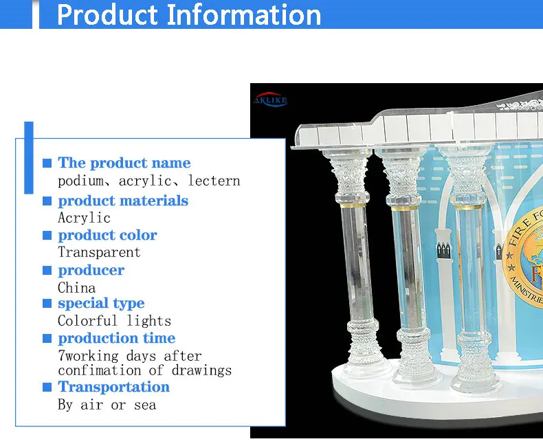 1. Высокое качествоКристальная колонна церковная кафедра ясный акрил для школы или церкви. 2. Ясный плексиглас люцитовый Подиум лектор. 3. Конкурентоспособная цена и высокое качество. 4. Быстрое время доставки, чтобы вы получили в ближайшее время, по воздуху. 5. Различный модный современный дизайн. 6. Надежная безопасная упаковка и доставка. 7.Индивидуальный логотип: Используйте различные способы, чтобы сделать в соответствии с вашим логотипом нужно дополнительно $50 8. Цена каталога-это цена одного товара. Если заказ большой, мы предложим лучшую цену. 9.Так как наш продукт настроен, Конкретный Фрахт должен быть подан логистической компанией. Пожалуйста, дайте мне немного времени. Мне нужно связаться с моим экспедитором онлайн, чтобы спросить о своевременной доставке, Чтобы предоставить вам самую эффективную информацию. 10.Мы поддерживаем безопасную и быструю транспортировку, специальные перевозки для согласования со стандартами логистики продавца.