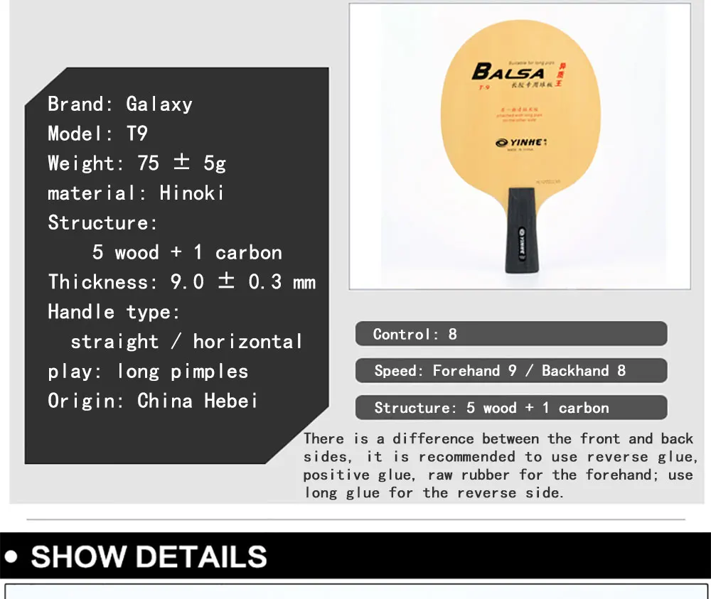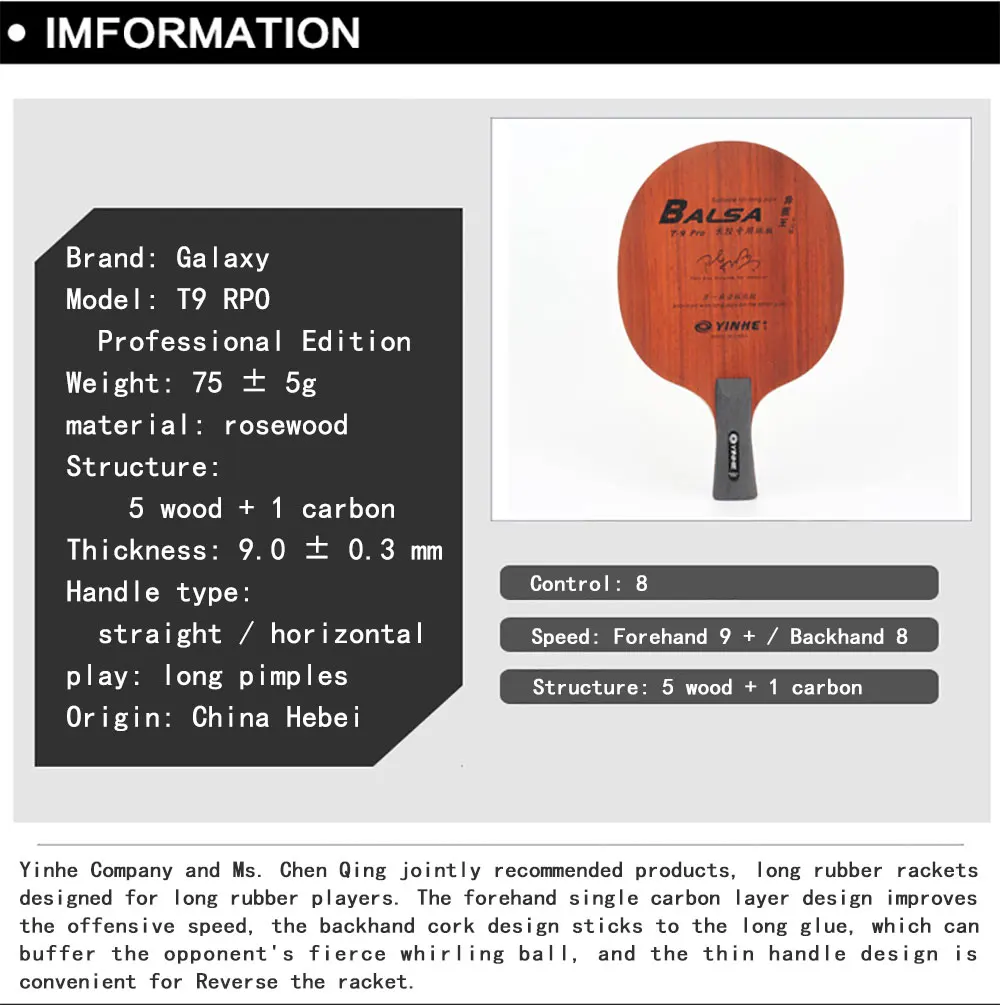 Бренд: Galaxy Модель: T9 RPO Professional Edition Вес: 75 ± 5g Материал: палисандр Структура: 5 древесины + 1 углерод Толщина: 9,0 ± 0,3 мм Тип ручки: прямой/горизонтальный Играть: длинные шипы Страна происхождения: Китай (материк) Хэбэй Управление: 8 Скорость: 9 +/задняя сторона 8