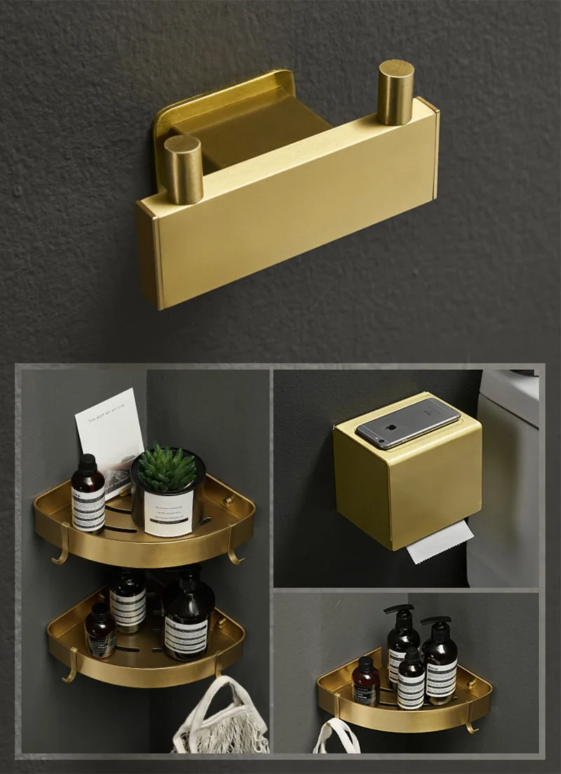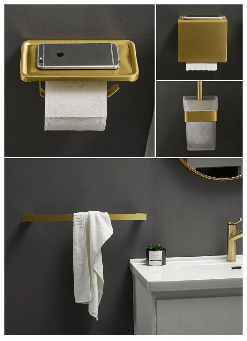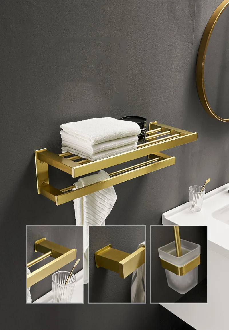 Матовый золотой набор для ванной комнаты, вешалка для полотенец, угловая полка, крючки для халатов, держатель для туалетной щетки, алюминиевая фурнитура для ванной комнаты