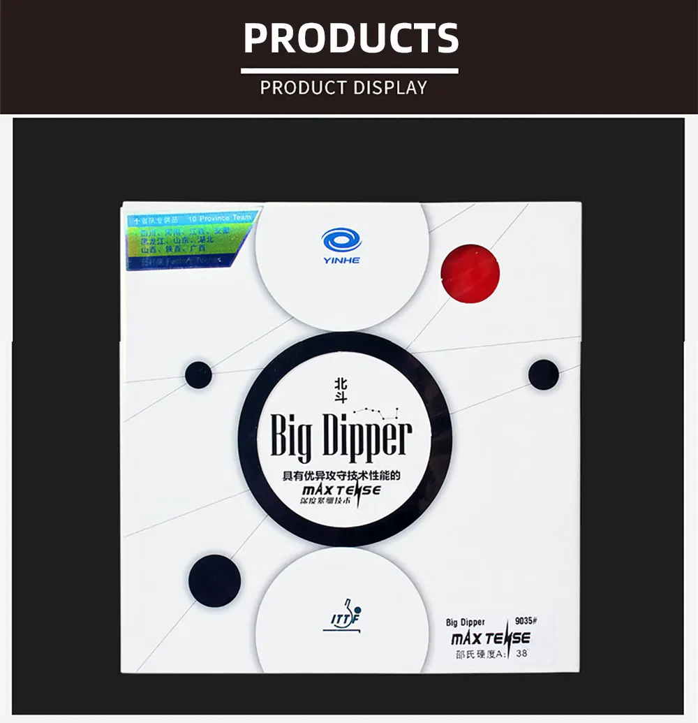 Большой Диппер: мяч для тактика Благодаря встроенному тензорному эффекту от технологии Yinhe MAX TENSE, Big Dipper принимает китайскую липкую резину на новые высоты, полностью используя потенциал губки с арбалетом, губка, которая содержит Новинка мячом не-celluloid в виду. Большой Диппер позволяет агрессивно играть, сохраняя высокую степень стабильности, тем самым обеспечивая плавные переходы между правонарушение и защиту. Толщина губки: 2,2 мм Цвет резины: красный или черный Цвет губки: черная резина с синей губкой, Красная резина с флуоресцентной желтой губкой Цена указана только за одну резинку с губкой.