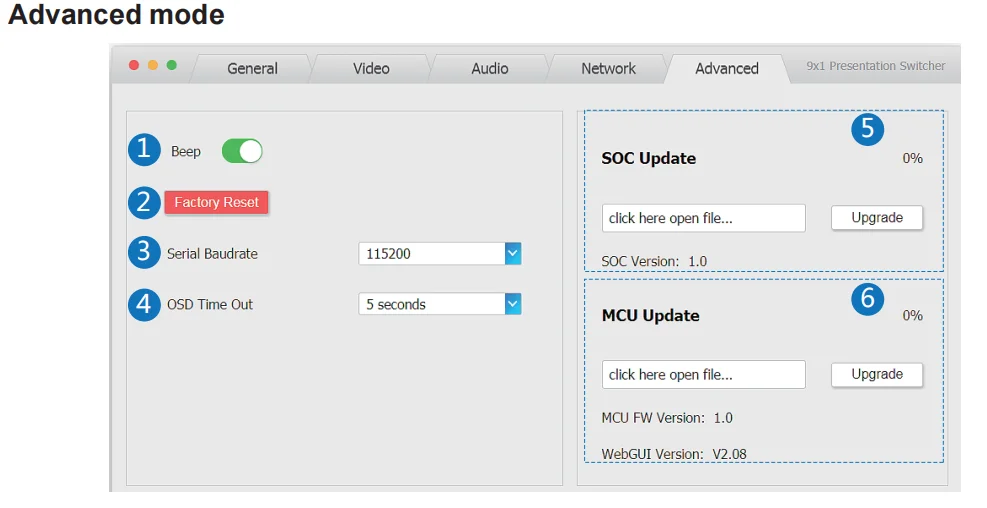 Управление осуществляется с помощью пульта ДУ, кнопки на панели, RS-232, локальной сети или веб-графического интерфейса