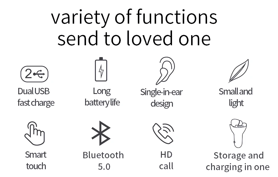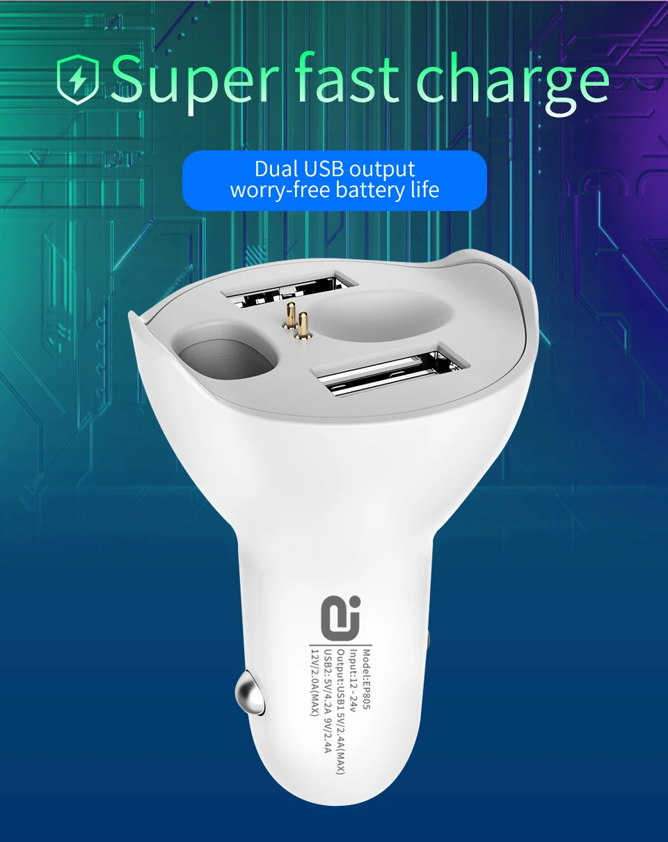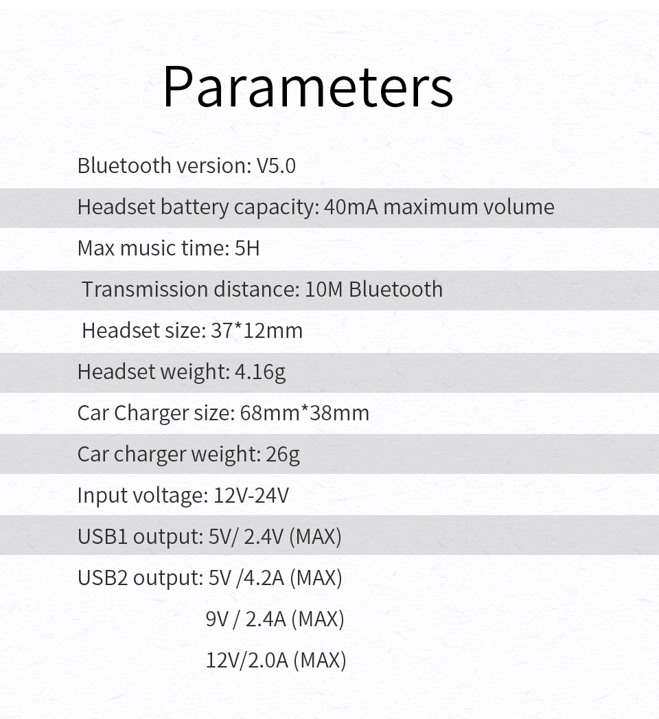 1. Двойная USB быстрая зарядка, USB выход: QC2.0/3,0/4,0/FCP/SCP/AFC Быстрая зарядка полностью совместима 2. Длительный срок службы батареи, Время разговора: около 2 ч Время работы в режиме ожидания: около 30 ч 3. Один в ухо дизайн, автомобильное зарядное устройство с наушниками 4. Маленький и светильник, всего 4,16 г 5.Smart touch, easliy operation и более удобный 6.Bluetooth 5,0, стабильное соединение 7. Вызов HD, интеллектуальное суждение и эффективное снижение уровня шума, подтверждающего четкость вызова, даже когда Вождение на высокой скорости может быть гарантировано Версия Bluetooth: V5.0 Емкость аккумулятора гарнитуры: максимальный объем 40 мА Максимальное время воспроизведения музыки: 5 ч Расстояние передачи: 10 м Bluetooth Размер гарнитуры: 37*12 мм Вес гарнитуры: 4,16 г Размер автомобильного зарядного устройства: 68 мм * 38 мм Вес автомобильного зарядного устройства: 26 г Вход напряжение: 12V-24V USB1 Выходная мощность: 5В/2,4 V (макс) USB2 Выход: 5 В/4,2 А (макс.) 9 В/2,4 А (макс.) 12 В/2,0 А (макс.)