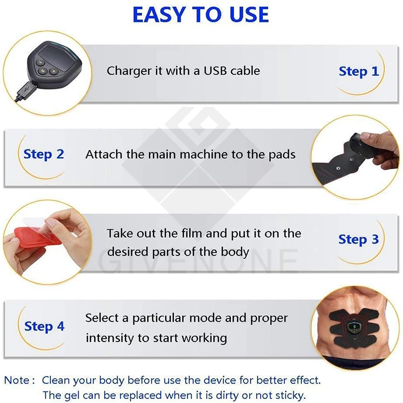 Шаг 1: зарядное устройство с usb-кабелем Шаг 2: Прикрепите основную машину к подушечкам Шаг 3: выньте пленку и положите ее на нужные части тела Шаг 4: Выберите определенный режим и соответствующую интенсивность для начала работы Примечание: Очистите тело перед использованием устройства для лучшего эффекта. Гель можно заменить, когда он грязный или не липкий