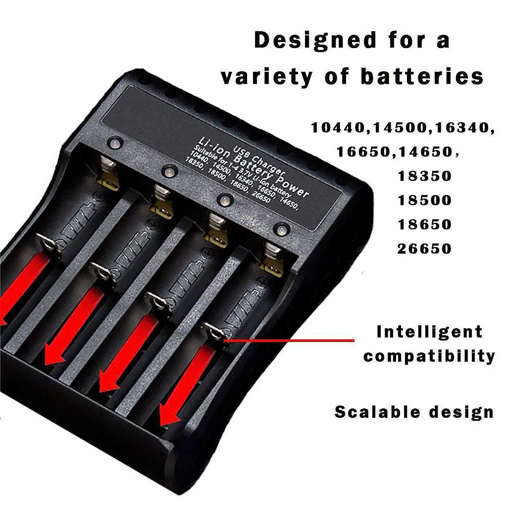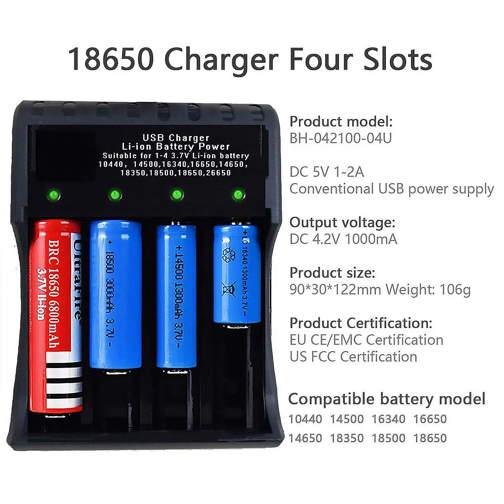 Это зарядное устройство с 4 слотами не перезаряжает аккумуляторы и подходит для зарядки многих типов батарей, таких как 14650,18350,18500 и 18650 и т. д.