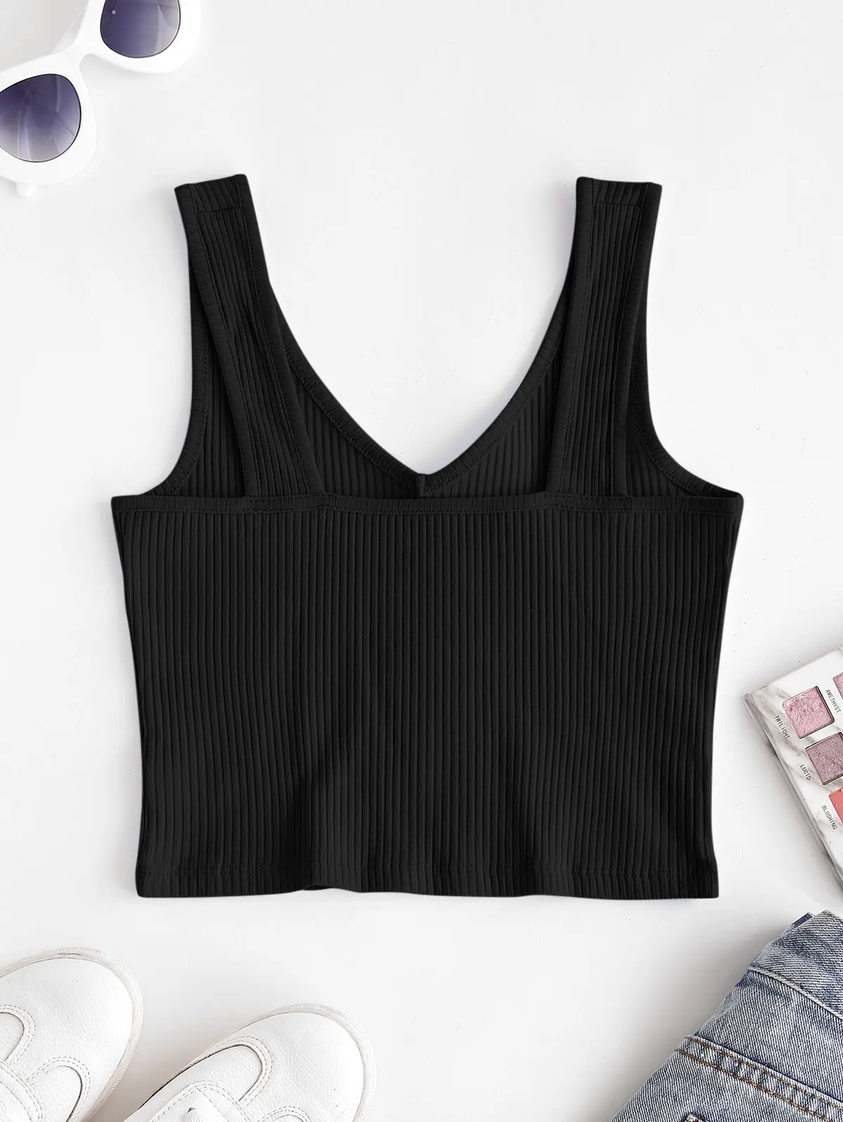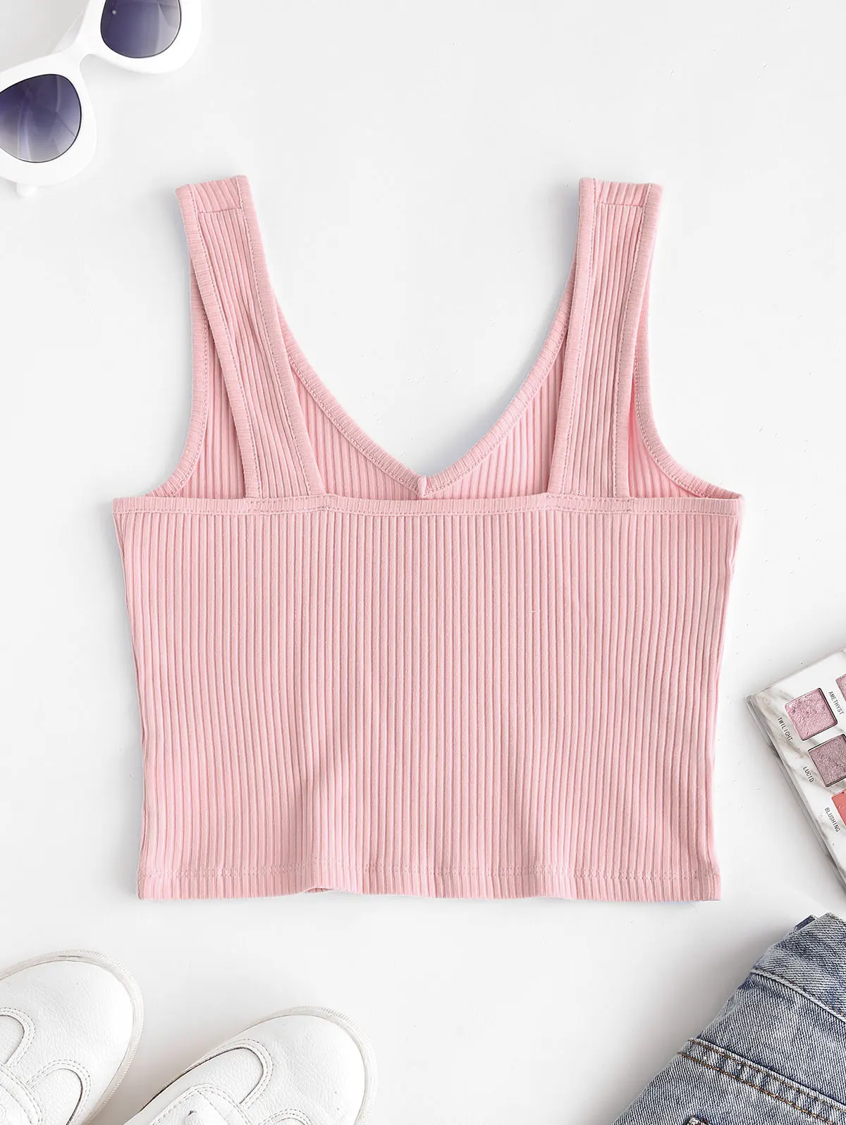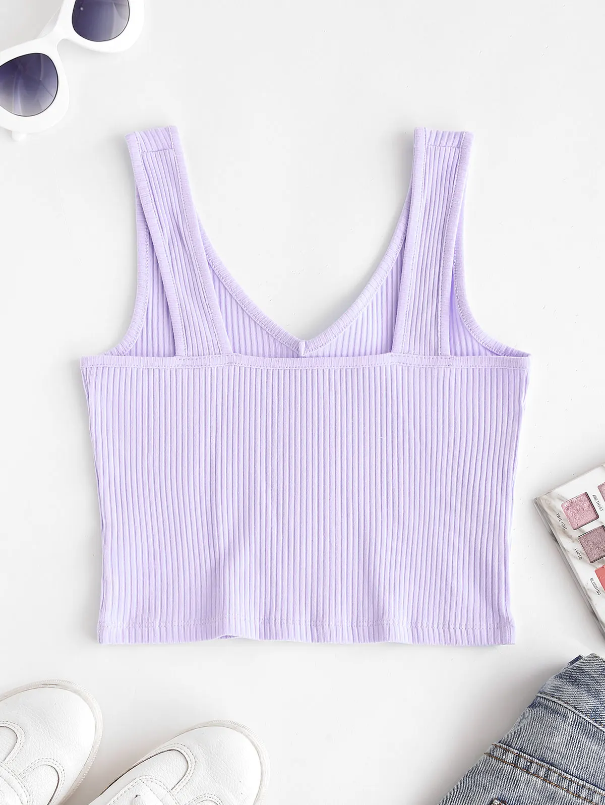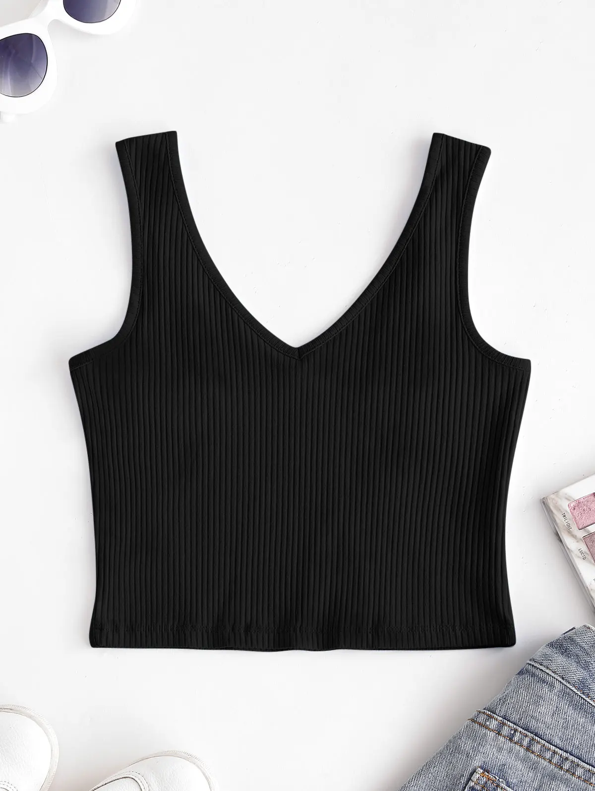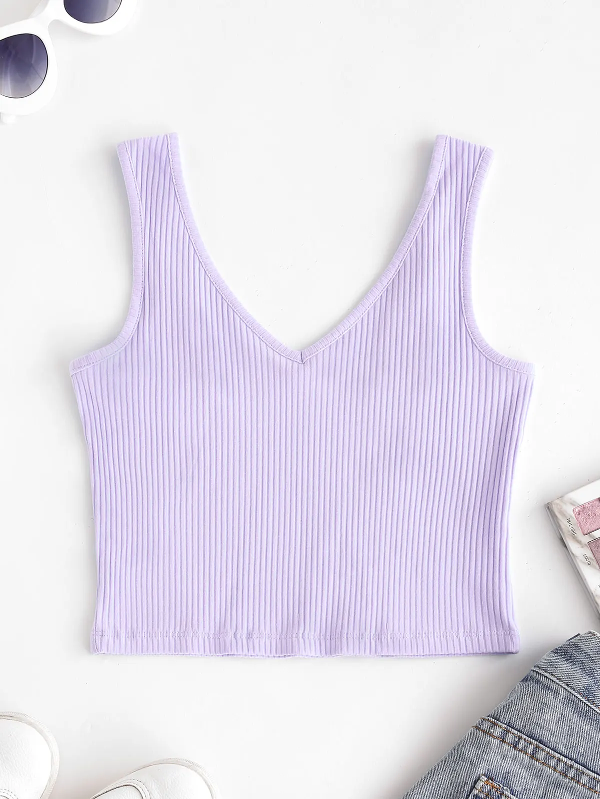 Простой и сладкий, этот гладкий кроп-топ сочетается с классическим дизайном в рубчик и лестным v-образным вырезом для кокетливого солнечного дня, который отлично сочетается со всем, от джинсов с высокой талией до мини-юбки.