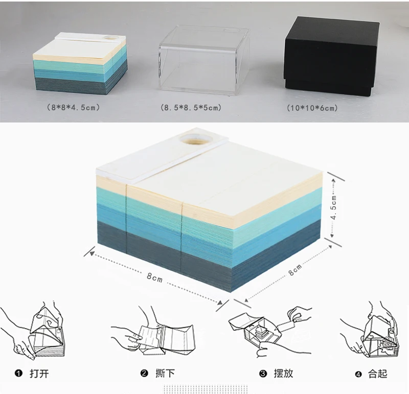 Материал: бумага Стиль: 3d архитектура Размер: 80*80*40 мм Страница: 120-160 листов Посылка включает в себя: 1x блокнот с акриловой коробкой Примечание: светильник и различные дисплеи могут привести к тому, что цвет товара на картинке немного отличается от реального. Допускается погрешность в измерениях +/- 1-3 см.