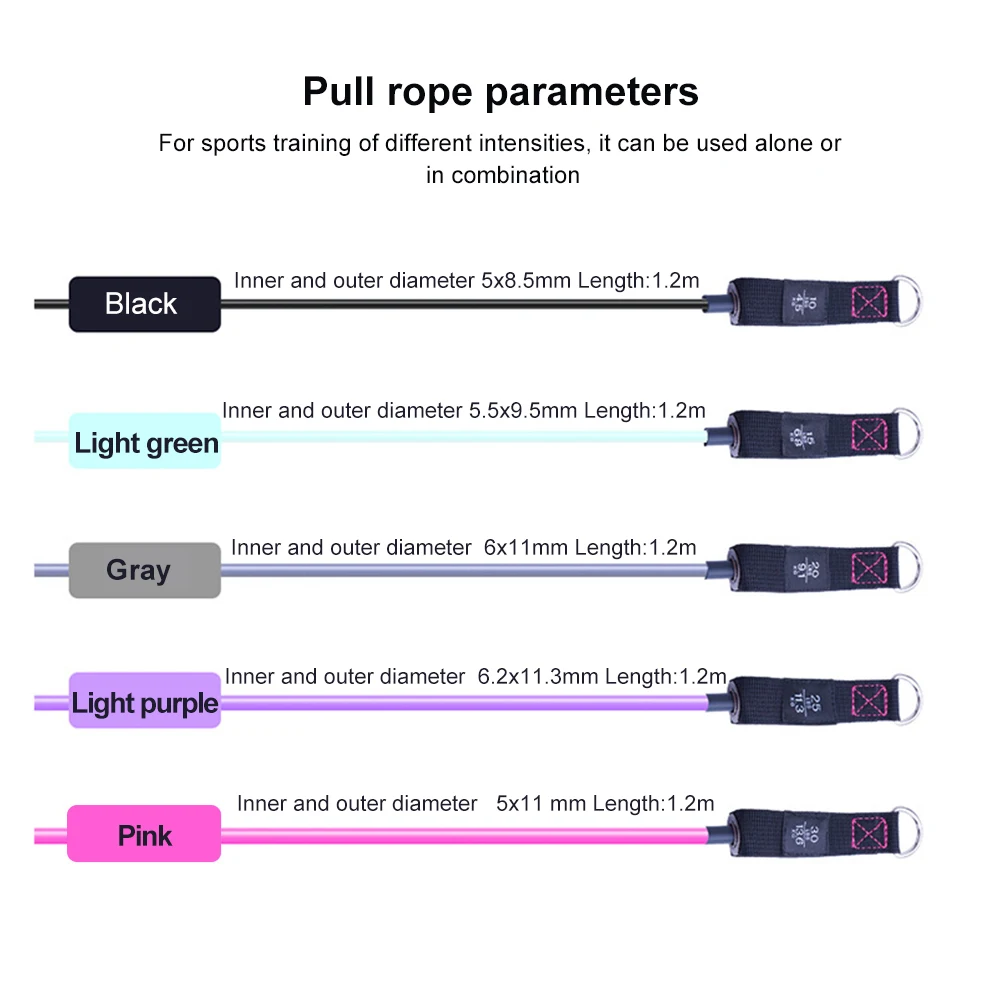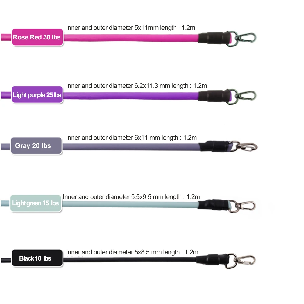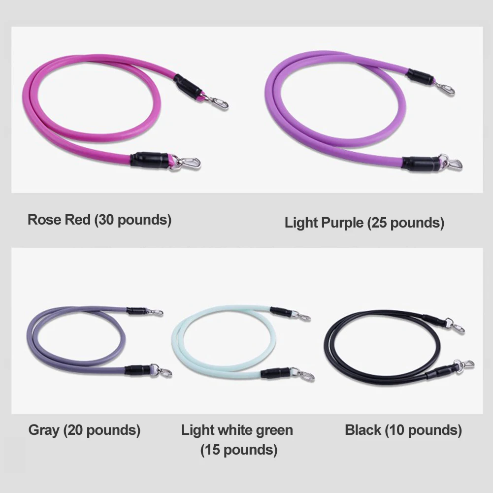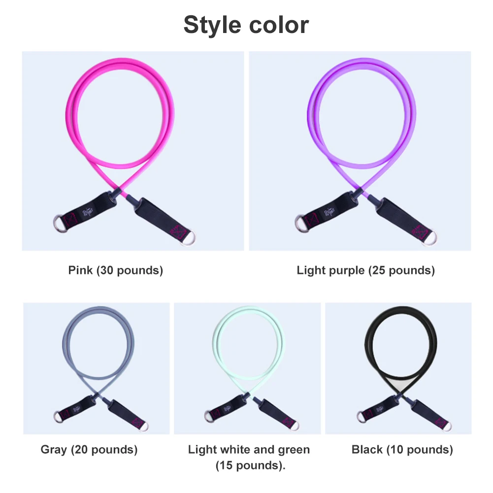 *2.There are five different sizes of tension rope, which will produce a total of 100 pounds of tension. You can also adjust it according to your requirements. Different colors of tension rope will have different pounds, including 30 pounds for pink, 25 pounds for purple, 20 pounds for gray, 15 pounds for light white green, and 10 pounds for black.