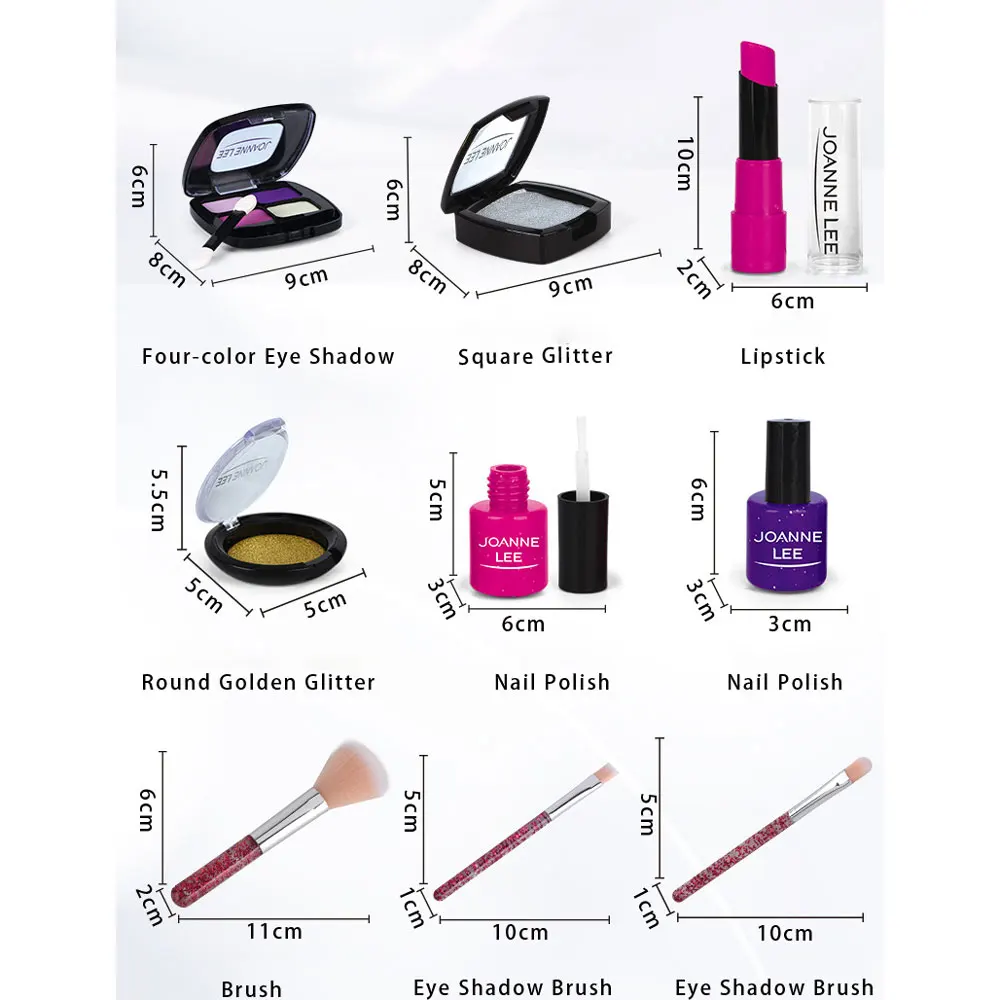-Изделие оснащено кистью для теней для век, тенями для век, кистью для губ, лаком для ногтей, кистью для румян, блеском для губ, помадой, зеркалом для макияжа HD.
