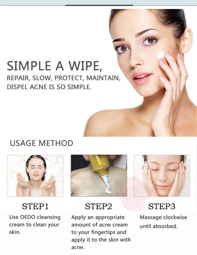 Шаг 1: Используйте очищающий крем OEDO для очистки кожи. Шаг 2: нанесите соответствующее количество крема от акне на кончики пальцев и нанесите его на кожу с акне. Шаг 3: массируйте по часовой стрелке до впитывания.