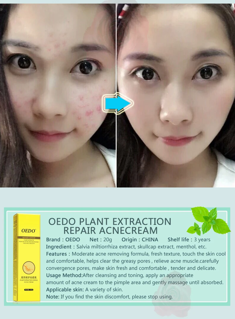 Бренд: OEDO Нетто: 20 г Происхождение: Китай Срок годности: 3 года Ингредиент: Экстракт Salvia miltiorrhiza, экстракт skullcap, ментол и т. д. Особенности: умеренная формула для удаления прыщей, свежая текстура, прикасаться к коже прохладной и удобной, помогает очистить жирные поры, избавляет от прыщей и мышечной массы, тщательно сближает поры, делает кожу свежей и удобной, нежной и деликатной. Способ применения: после очищения и тонизирования нанесите соответствующее количество крема от прыщей на область прыщей и аккуратно массируйте до впитывания. Подходящая кожа: разнообразие кожи. Примечание: Если вы обнаружите дискомфорт кожи, пожалуйста, прекратите использование.