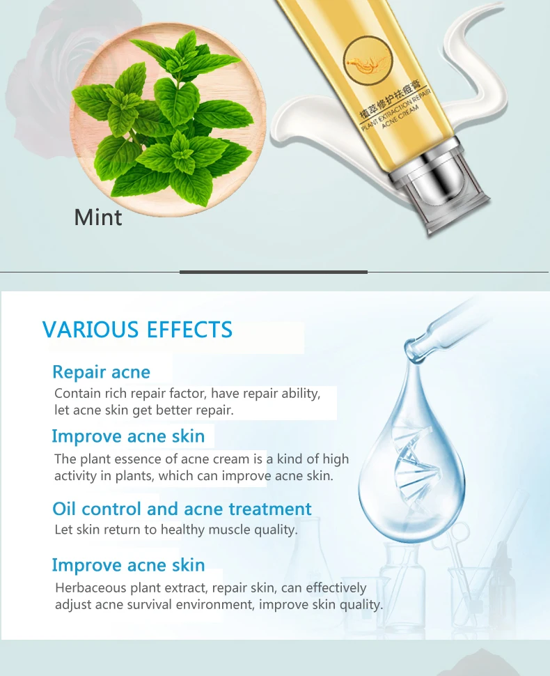 1. Ремонт акне Содержит богатый фактор ремонта, имеет возможность ремонта, позволяет коже акне лучше восстанавливать. 2. Улучшает акне Растительная эссенция крема от акне-это своего рода высокая активность в растениях, которая может улучшить кожу от акне. 3. Контроль масла и лечение акне Позвольте коже вернуться к здоровому качеству мышц. 4. Улучшает акне Травяной Растительный Экстракт, восстанавливает кожу, может эффективно регулировать среду выживания от акне, улучшает качество кожи.