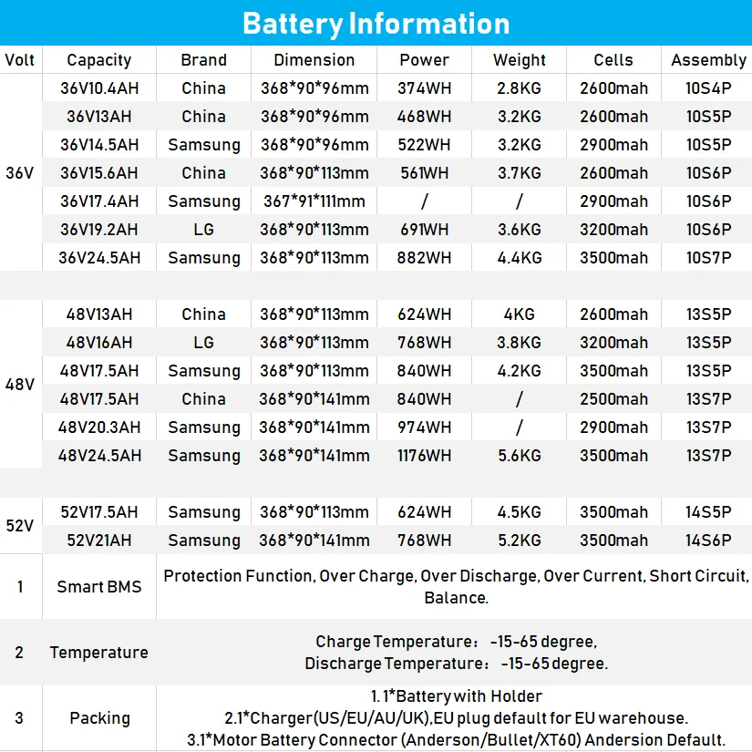 Упаковочный лист для двигателя: 1 комплект * Двигатель со средним приводом, встроенный контроллер 1 пара * тормозные рычаги (можно изменить на Гидравлические Тормозные датчики бесплатно в Китае, опционально) 1 пара * рукоятка 1 пара * цепное кольцо (BBS01,BBS02 44T/46T/48T/52T опционально, 1000W 42T/46T, 46T по умолчанию) 1 комплект * дроссельная заслонка большого пальца 1 комплект * Датчик скорости 1 * дисплей (DPC18, C965 дисплей, 850C, опционально) Кабель 1*4-1 EB-BUS 1 * аксессуары Подарки: 1 * Установочный ключ 1*36V 250W стикер (китайский склад, опционально) Дополнительный товар, указанный выше, пожалуйста, отметьте, когда вы заказываете, если вам нужно или хотите изменить. Упаковочный лист для батареи: 1 * батарея eBike 1 * зарядное устройство 1 * Соединительный кабель для аккумулятора двигателя (интерфейс Anderson & Bullet) 1 * Разъем XT60, пожалуйста, свяжитесь с нами, если он доступен прямо сейчас. Если доставка со склада ЕС, штепсельная вилка зарядного устройства по умолчанию является стандартом ЕС, пожалуйста, обратите на это внимание.
