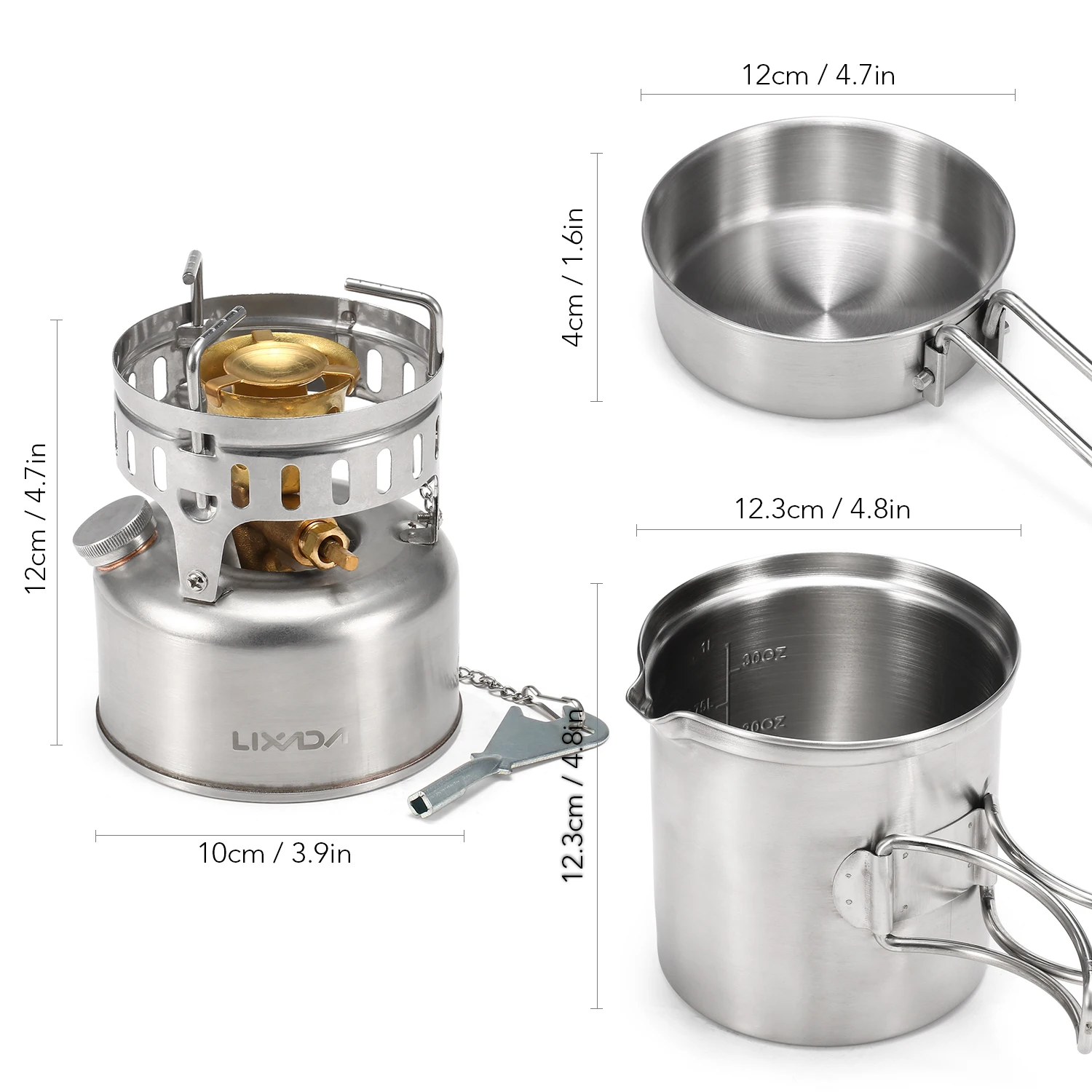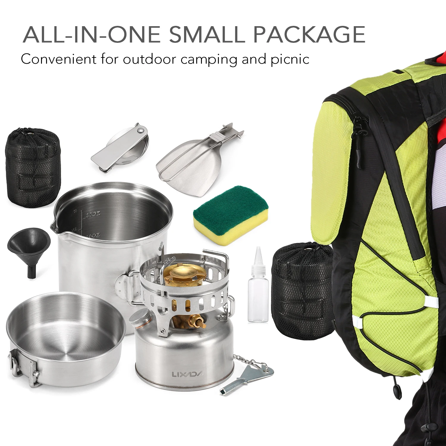 Этот набор посуды для кемпинга включает в себя бензиновую печь, кастрюлю, сковородку, складная ложка, складная ложка-вилка, чистящую губку, воронку, пустая емкость для масла и сетчатый упаковочный мешок, очень удобный для кемпинга, пешего туризма, альпинизма и других мероприятий на свежем воздухе.