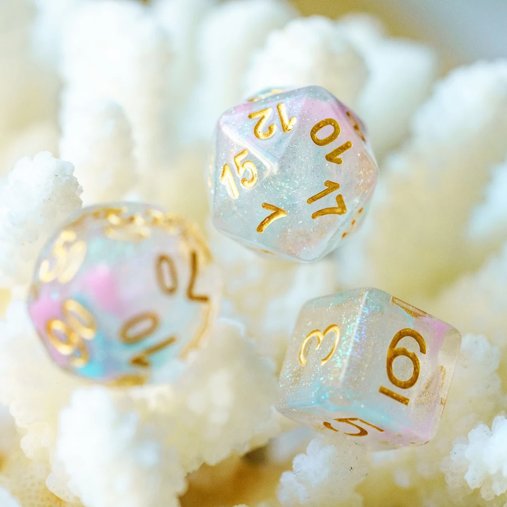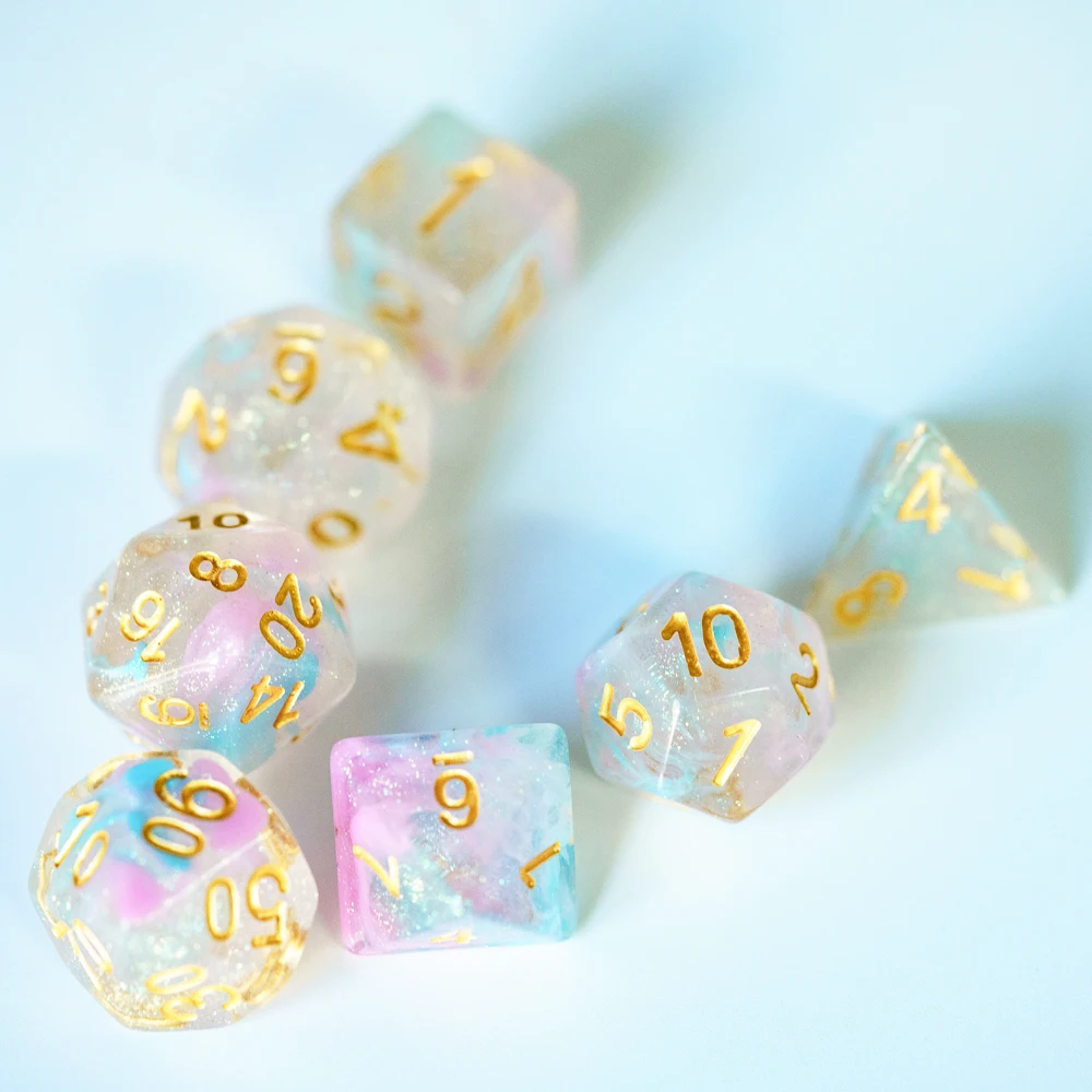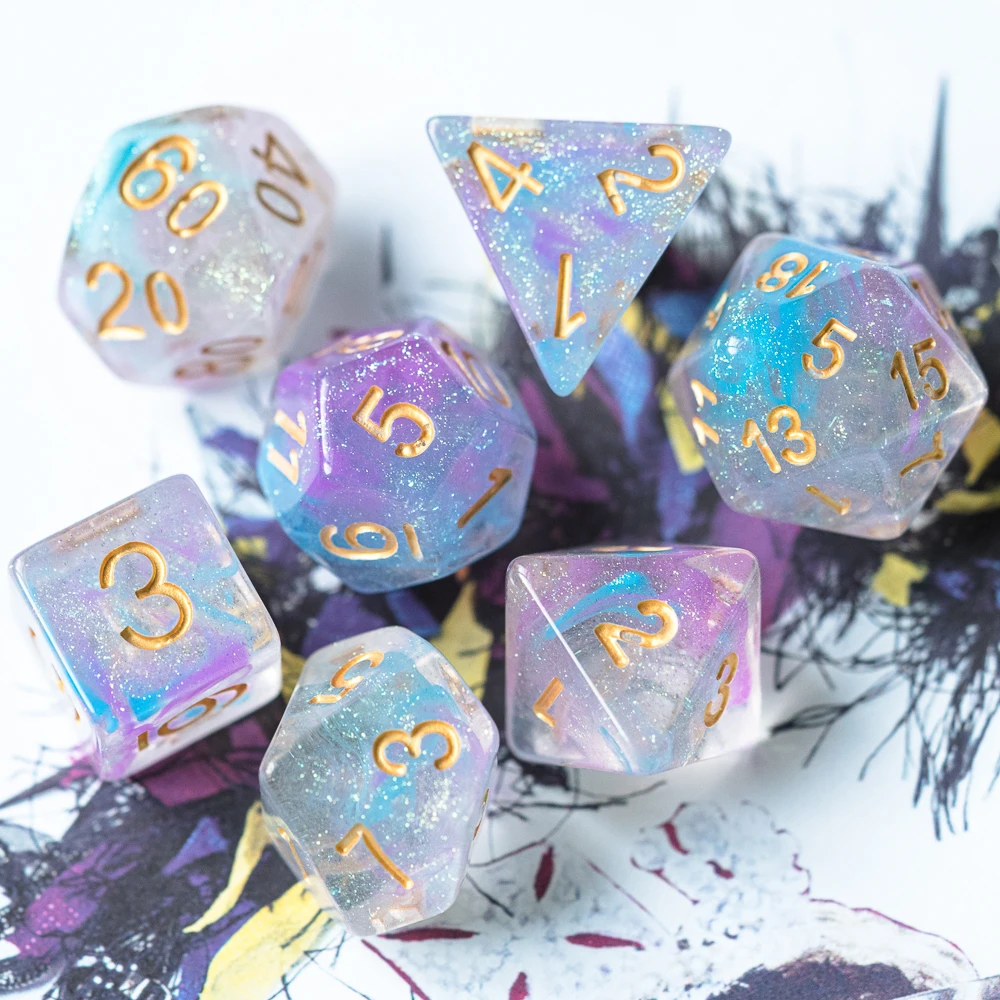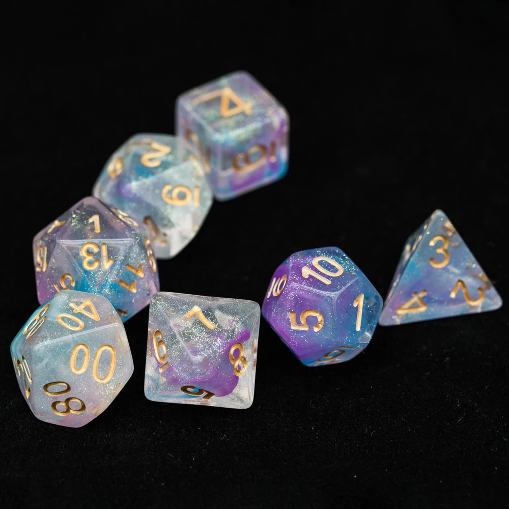 Это полный набор игральных костей, включающий 1 * D4, 1 * D6, 1 * D8, 1 * D10(0-9), 1 * D12, 1 * D20 и 1 * D %(00-90).