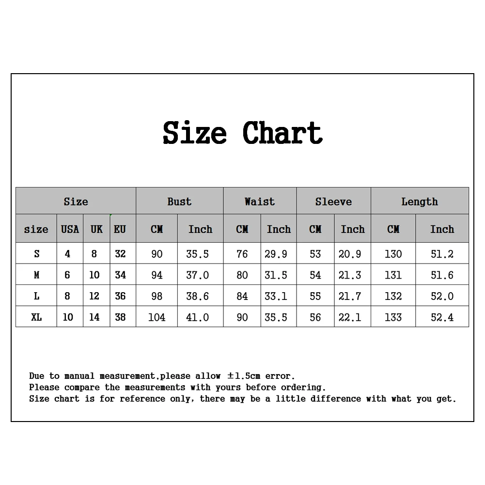 [Наш Размер S] Обхват груди: 90 см/35,5 дюйма, обхват талии: 76 см/29,9 дюйма, рукав: 50 см/23,9 дюйма, длина: 130 см/51,2 дюйма (прибл.)