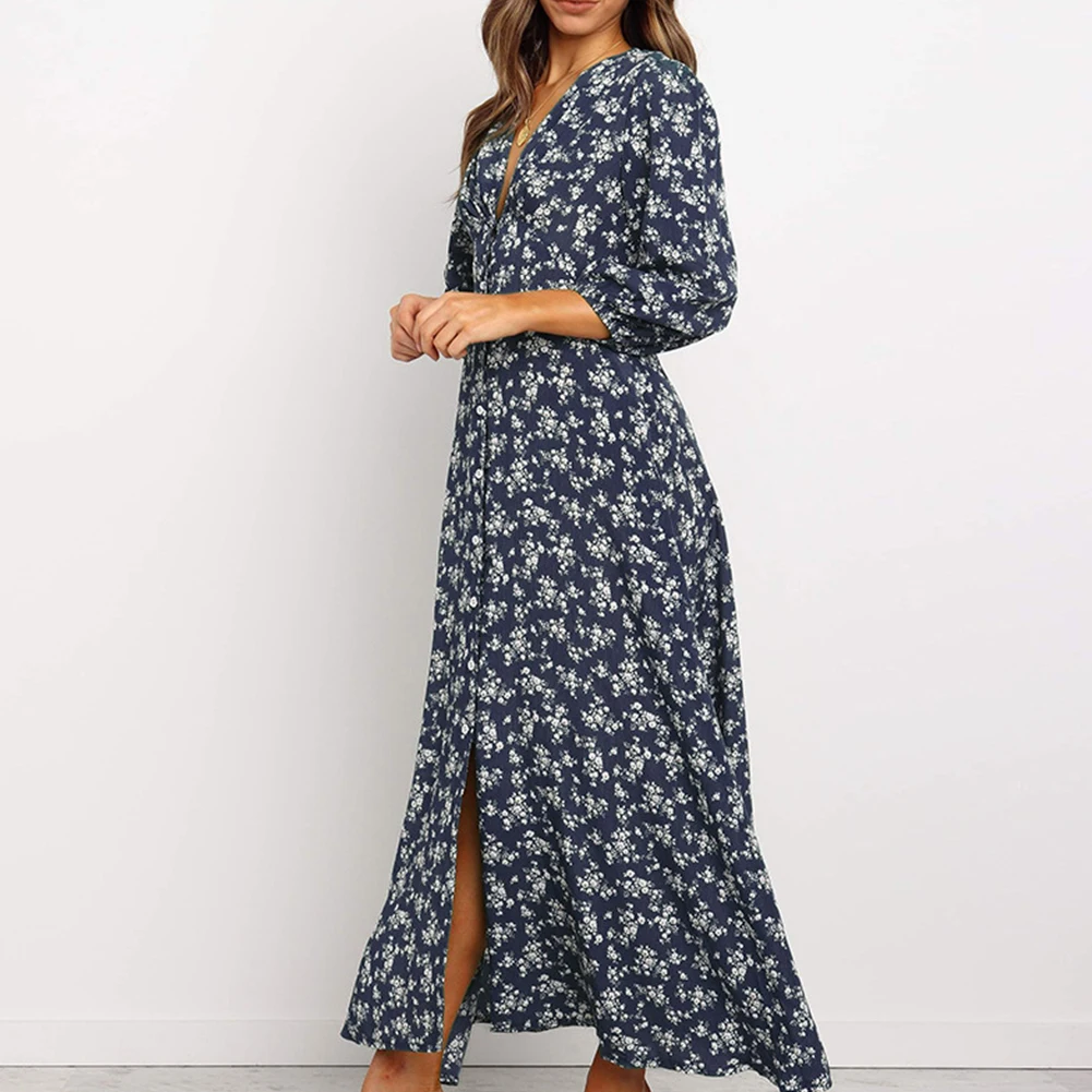 Женское элегантное шифоновое макси-платье с принтом и длинными рукавами, высокой талией и v-образным вырезом
