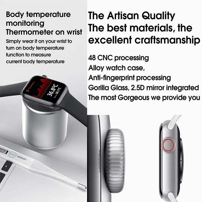 ◆ Водонепроницаемость IP68, термометр, частота сердечных сокращений, ЭКГ, BP, SPO2, 5-е поколение, 44 мм взаимозаменяемы часы, беспроводное зарядное устройство, дисплей 1,75 дюйма, срок службы батареи 7 дней