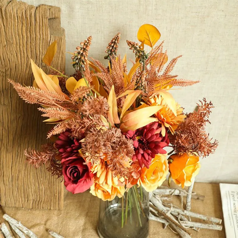 Комплектация: 1 букет искусственных цветов Материал: шелк Цвет: осень Размер: длина 44 см (подробности см. На картинке ниже) Повод: осеннее украшение, декор на День Благодарения. Особенность: 1. Высококачественный искусственный цветок из шелка Свадебный букет из роз цветов. Искусственная Роза bouqet. 2. Область применения: свадьба, офис, отдых, спальня, гостиная, журнальный столик, подоконник на балконе и так далее.