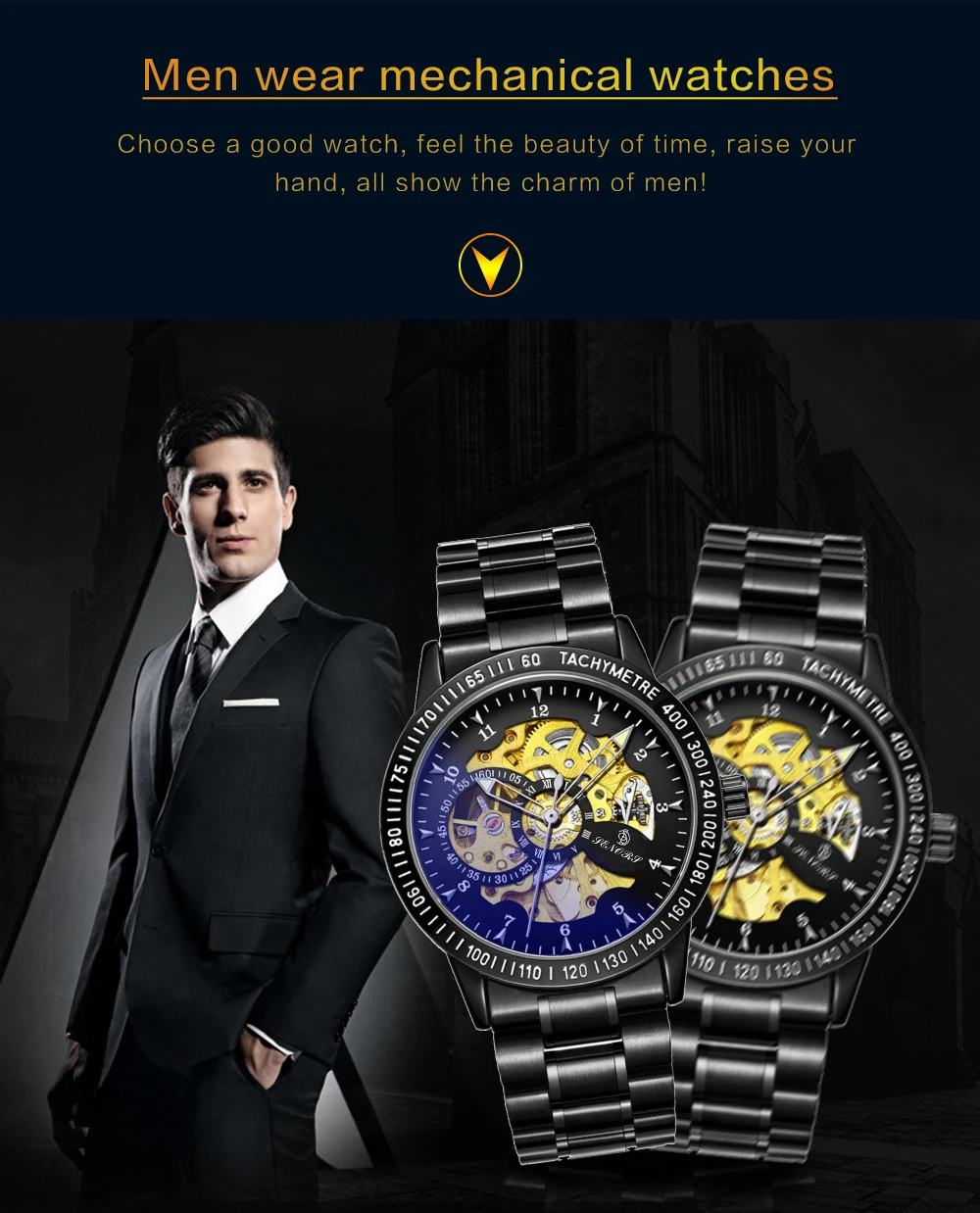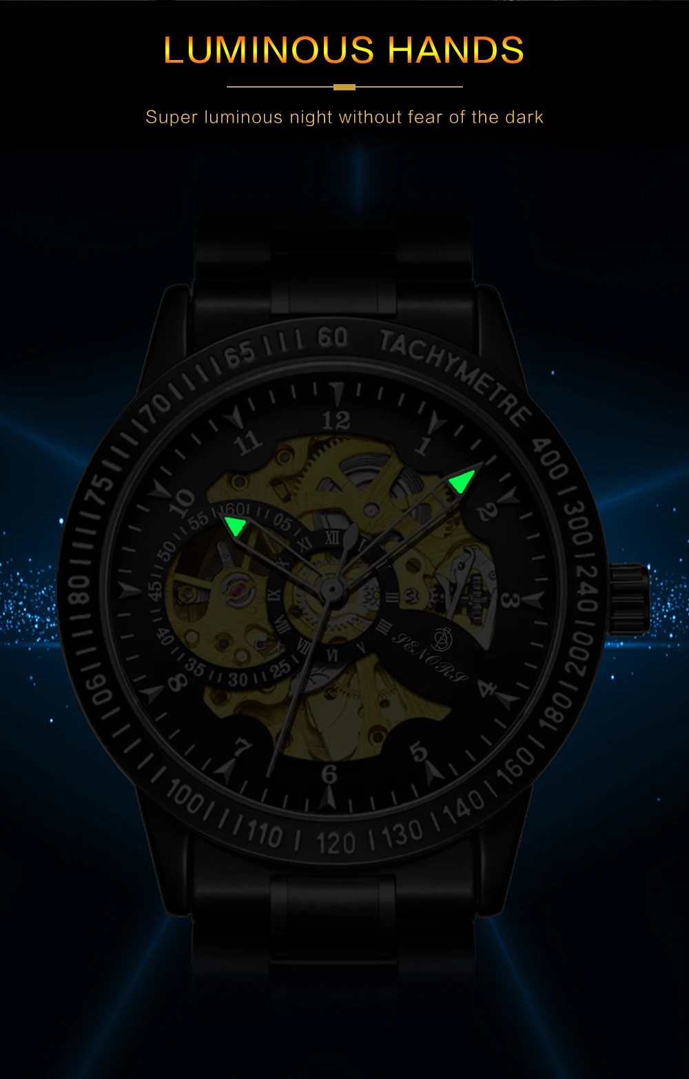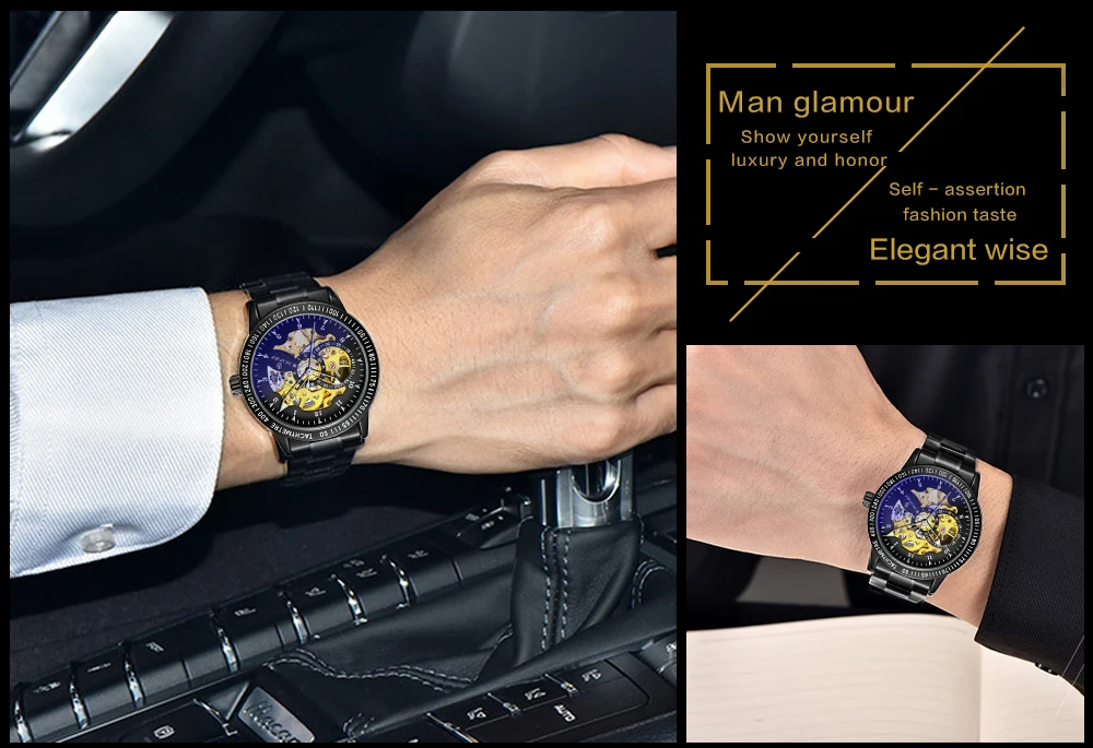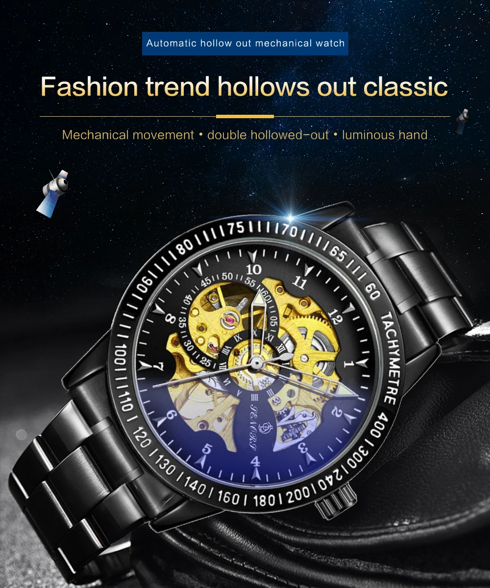 Автоматические черные мужские часы с двойным полым циферблатом, механические наручные часы, водонепроницаемые часы из нержавеющей стали для мужчин