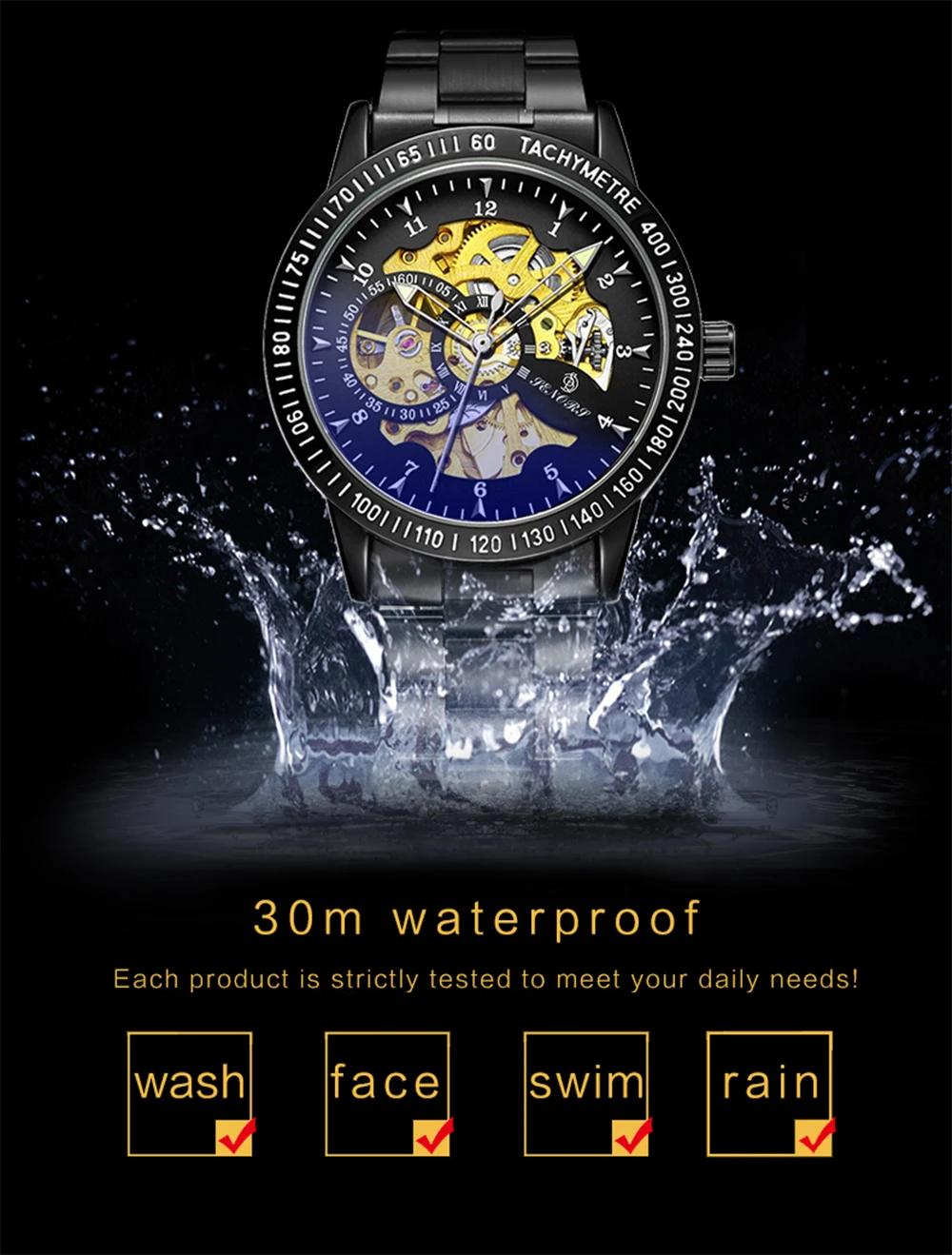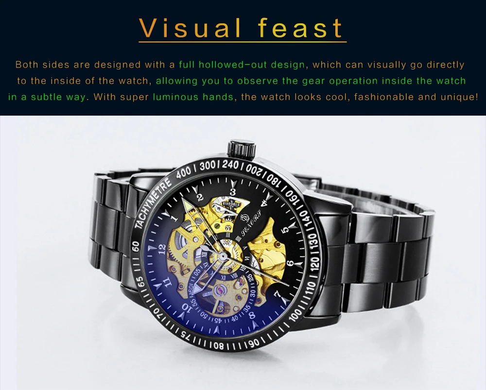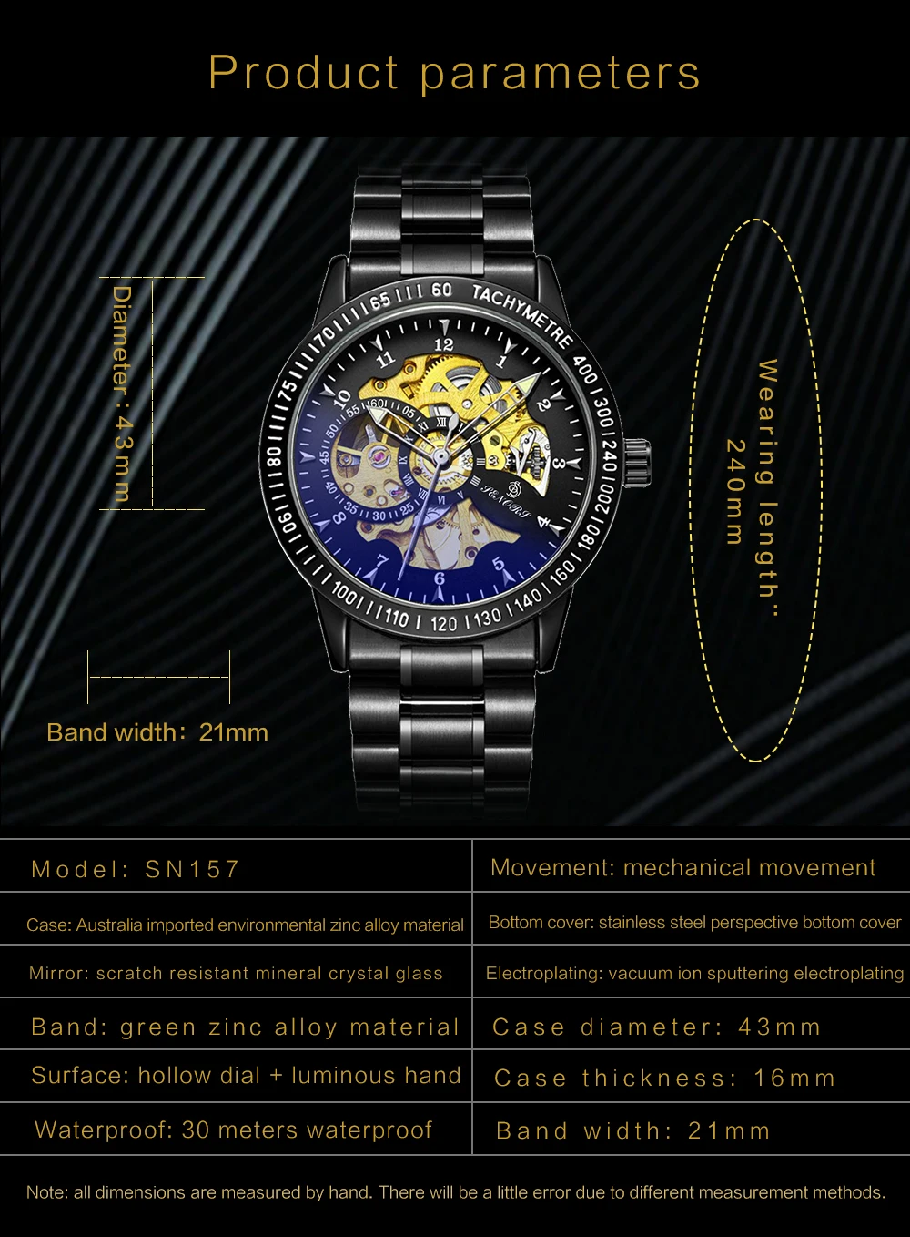 Описание: 1. 100% Оригинальные часы 2. Точные механические часы для точного хранения времени 3. Автоматическое механическое движение 4. Австралийский импортный экологичный чехол из цинкового сплава 5. 30 м водонепроницаемый 7. Двойной полый циферблат, который может визуально проникать внутрь часов Характеристики (прибл.): 1. Диаметр корпуса часов: около 4,3 см 2. Толщина корпуса часов: около 1,6 см 3. Длина ремешка: около 24 см 4. Ширина ремешка: около 2,1 см 5. Вес часов: около 146 г