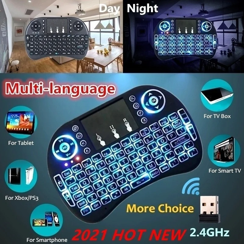 2,4G мини-клавиатура с тачпадом, светодиодный подсветкой, мультимедийными кнопками управления и кнопками управления ПК.