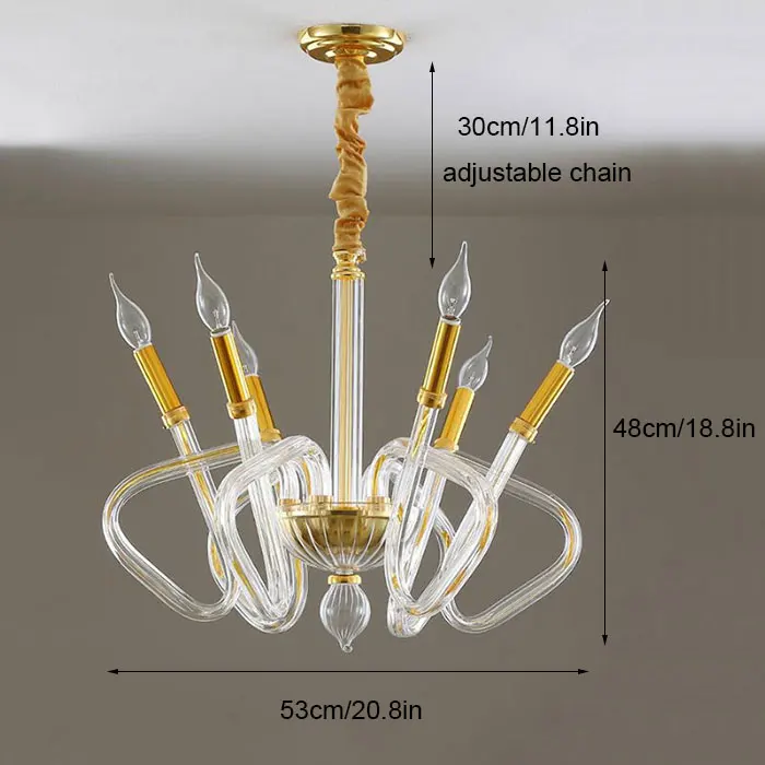 Материалы: металл, стекло Вход напряжение: AC 100-240V 50/60Hz Источник света: лампа накаливания, энергосберегающая лампа или светодиодный светильник Тип лампы: 6 шт. E14 лампы Лампа включает или нет: лампочки не включены Применение: гостиная, столовая, кабинет, спальня, ресторан, лобби, другие