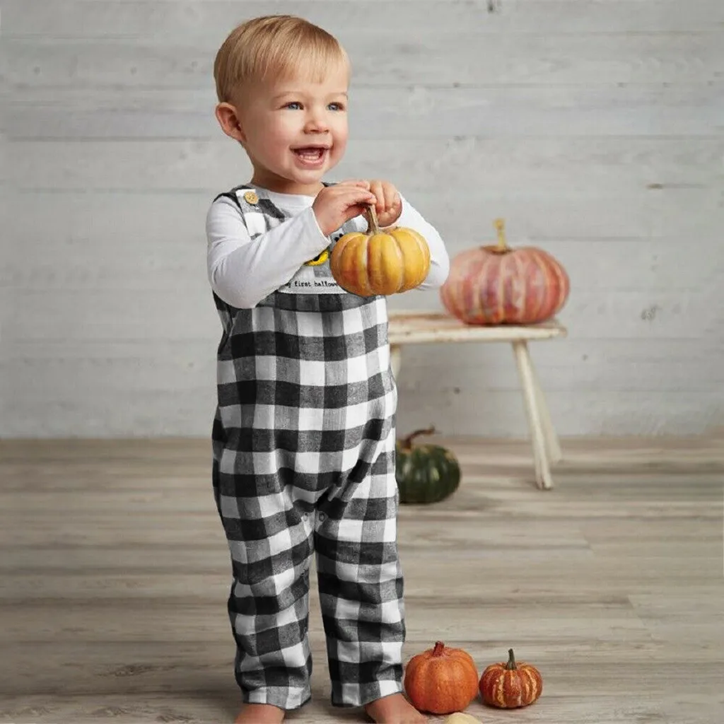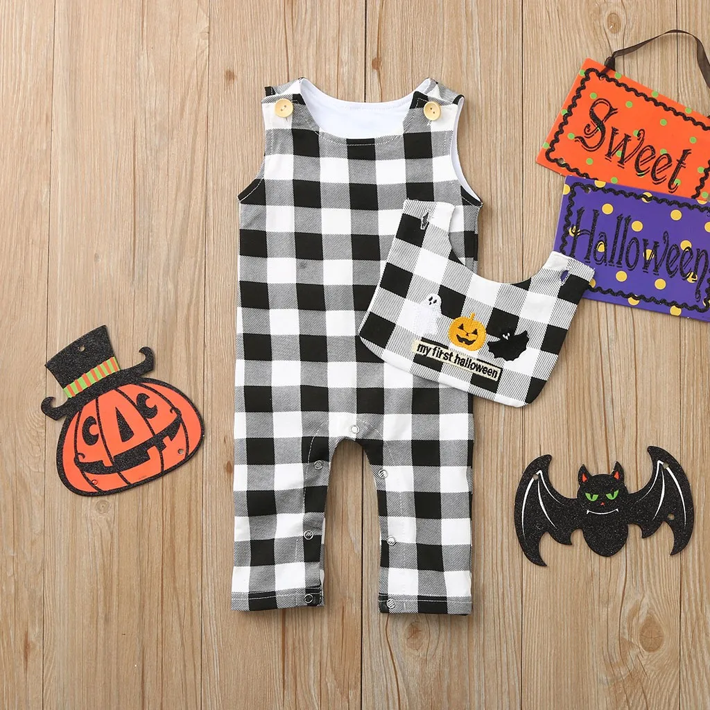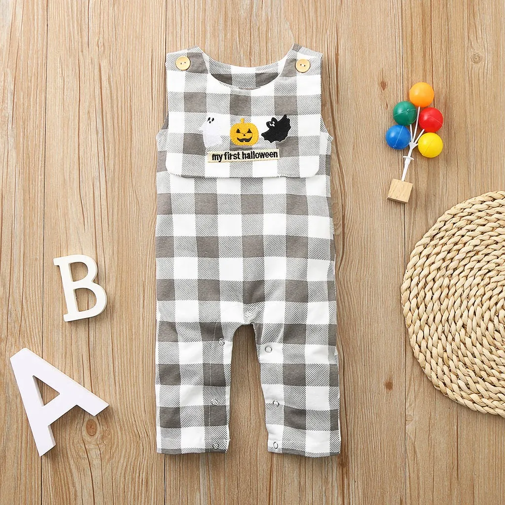 Комбинезон в клетку с принтом тыквы для маленьких мальчиков и девочек на Хэллоуин, комбинезон + комбинезон, комплект одежды