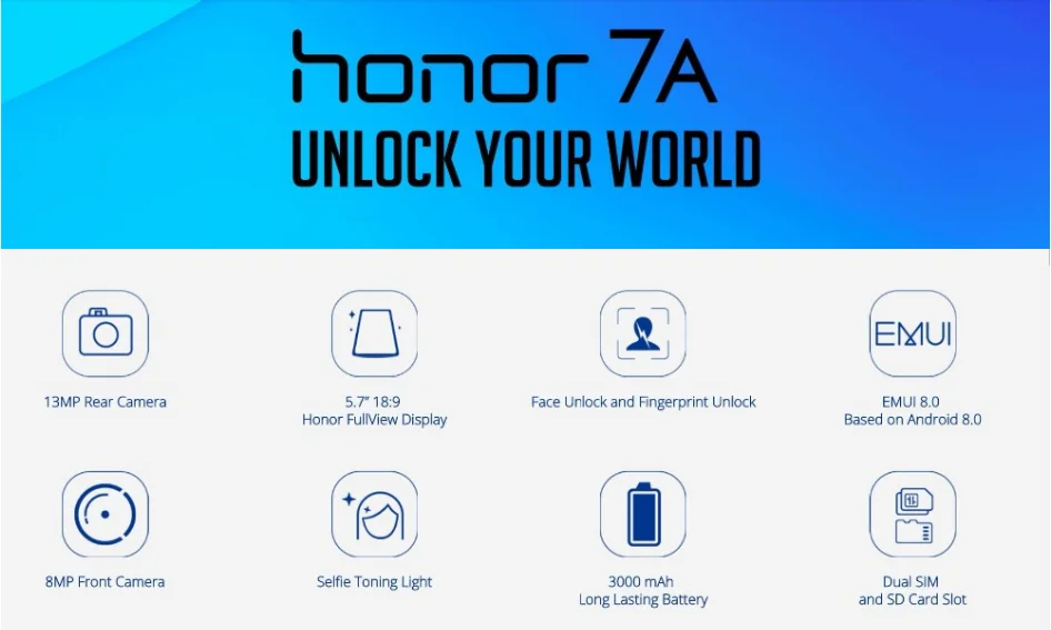 Honor 7A оснащен безрамным 5,5-дюймовым дисплеем Honor FullView с кинематографическим соотношением сторон 18:9, что обеспечивает захватывающий опыт для потоковой передачи видео и игр.