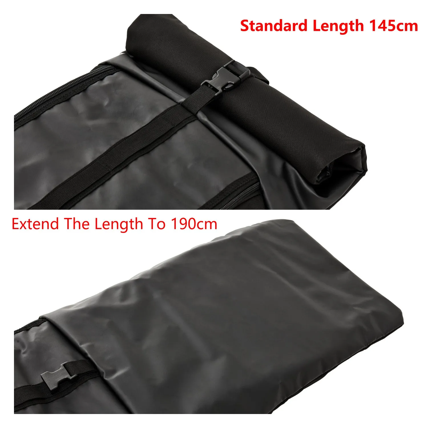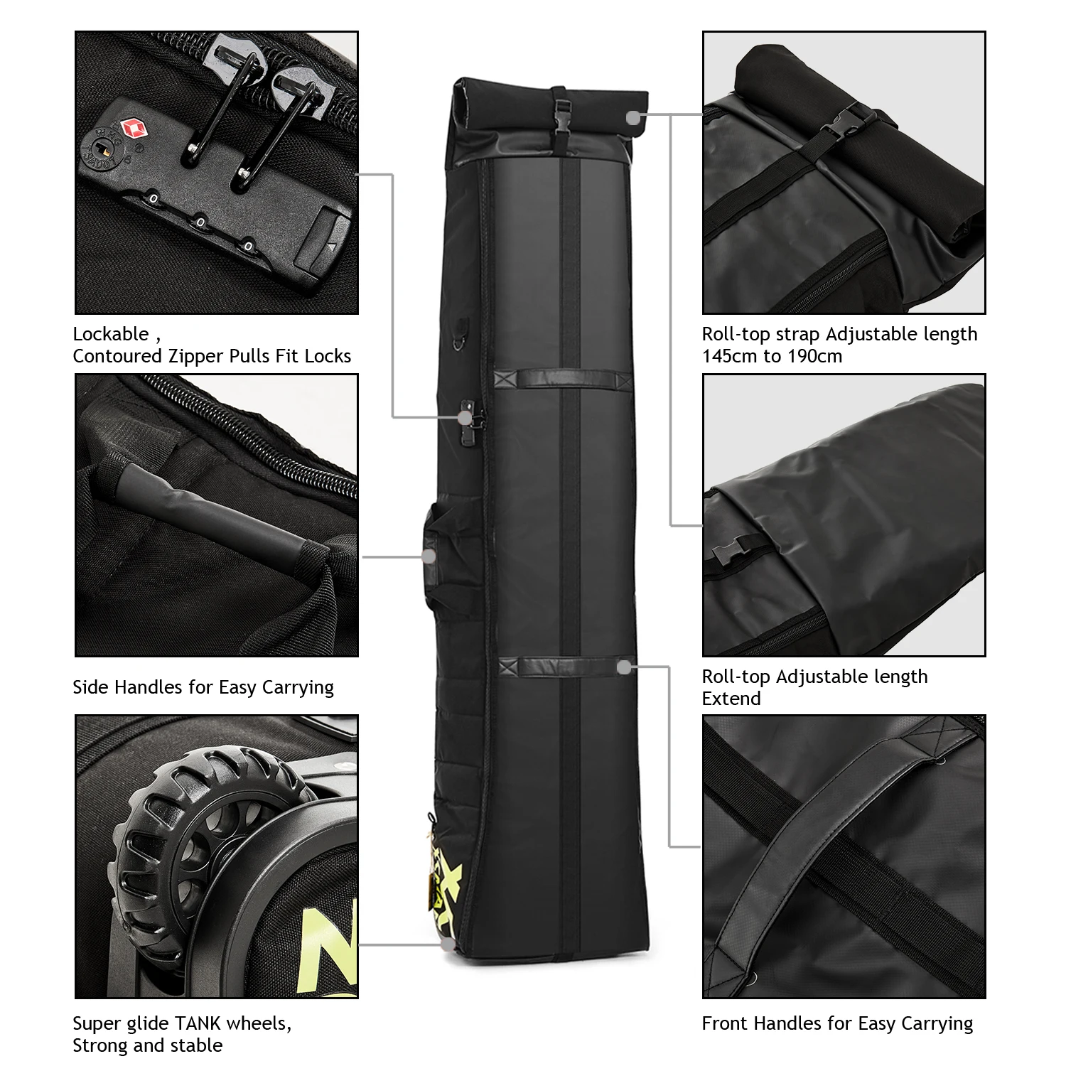 1,The XCMAN TEAM wheels snowboard bag is big enough to fit 2 snowboards with bindings attached,or 1~2pair alpine ski with bindings, boots and a whole load of of your other gear too. 2,The tough rubberised handle and super glide wheels make any airport a doddle. Fully padded from tip to tail and with a semi rigid end it will protect all your equipment in transit. 3,We installed a password lock outside the bag for security,lock the zipper.Full length bomb proof zip, Super glide wheels Tough rubberised handlle Fully padded for protection Room for 2 pairs of skis and more.Inner Two Side stash pocket,there is can put inside your socks ,charger or other samll gears. 4,Adjustable Length 145cm to MAX 190cm length, 43cm width. 160 litre capacity.Outer Shell: Polyester 900D / TPE 500D;Lining: Polyester 600D. 5,When the winter is end, you just roll it up and it's a fifth of its OPENING size and you can put it in your closet or anywhere and it doesn't take up space.How to Roll it up and store ?you see our pictures or video.