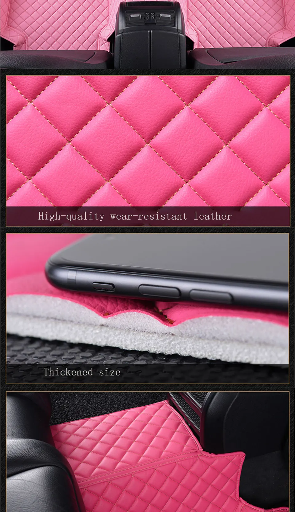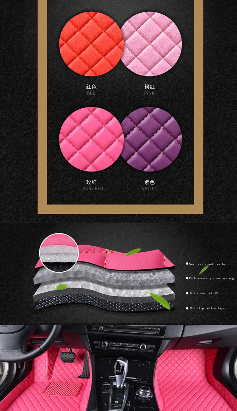 Название: подгоняйте напольный коврик автомобиля Модель: SLDZ0016 Материал: из искусственной кожи Подходящая модель автомобиля: на заказ Цвет: розовый/фиолетовый/розовый/красный Характеристики: нескользящая, водонепроницаемая, легко моется.