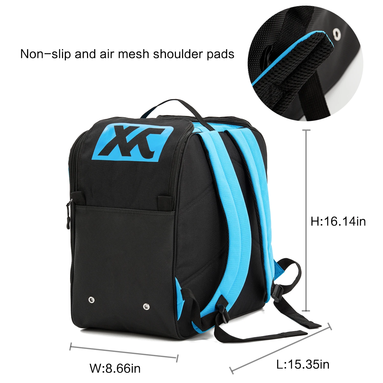 1,External fabric material: 600D polyester PVC coated - professional quality! / PU leather (weather resistant) 2,Plenty of space for you boots, gloves, cap. Additional 2-way zippered front pocket and 1 mesh bag. Backpack system with adjustable carrying straps, comfortable back padding and carrying handle. 3,The LEFT And RIGHT side of the top have Separate small compartment, can be loaded ski gloves,google,wallet by means of zipper opening on the sides. 4,Bottom with "rubber spike feet" to prevent slipping when slippery,and Easy to clean and waterproof. 5,The front side have Convenient Mesh pocket to Secure your gloves or other small thing.
