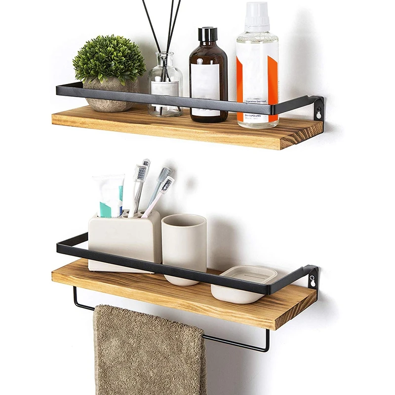 Полки для хранения-плавающие полки изготовлены из высококачественной древесины с влагонепроницаемой, термостойкой. Металлическая конструкция с защитными щитками и держателями для полотенец, прочная, прочная несущая способность.