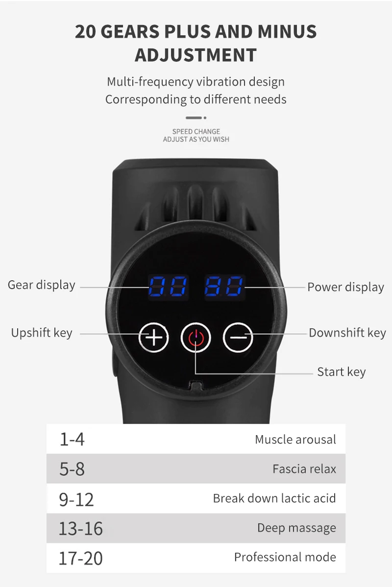 Отрегулируйте частоты в соответствии с назначением, для разогревания, облегчения болезненности, травмированных мышц, боли в мышцах и активации, облегчения герметичности; Увеличение до более высоких скоростей для больших и более сильных групп мышц.