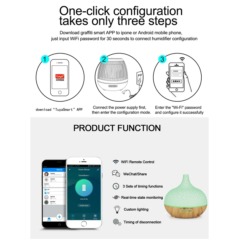 Функция синхронизации: вы можете установить таймеры для включения/выключения вашего смарт-диффузора в определенное время каждый день или в определенные дни, которые вы выбираете. Подходит для вашей жизни и экономит на счетах за электричество. (Автоматическое выключение при исходе воды)