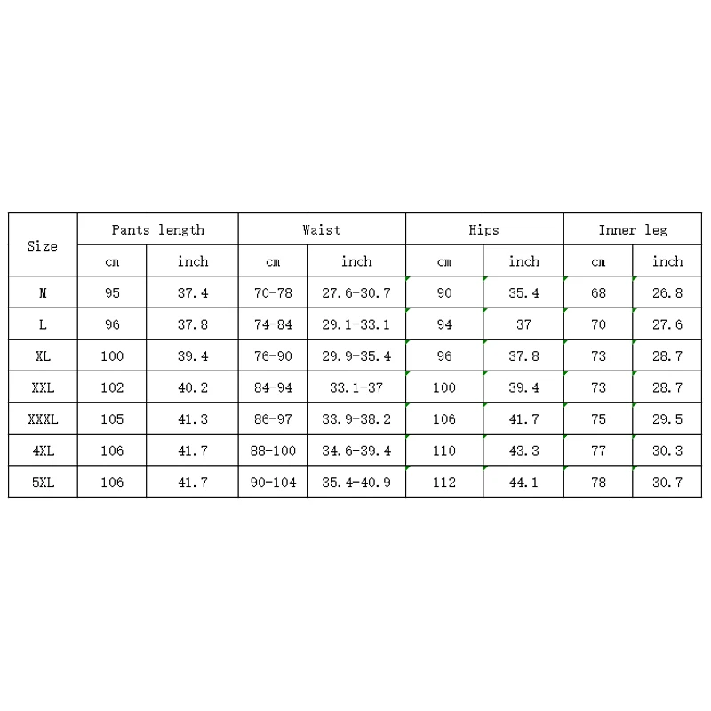 XXXL Длина брюк: 105 см (41,3 дюйма); Талия: 86 ~ 97 см (33,9 ~ 38,2 дюйма); Бедра: 106 см (41,7 дюйма); Внутренняя нога: 75 см (29,5 дюйм (ов)