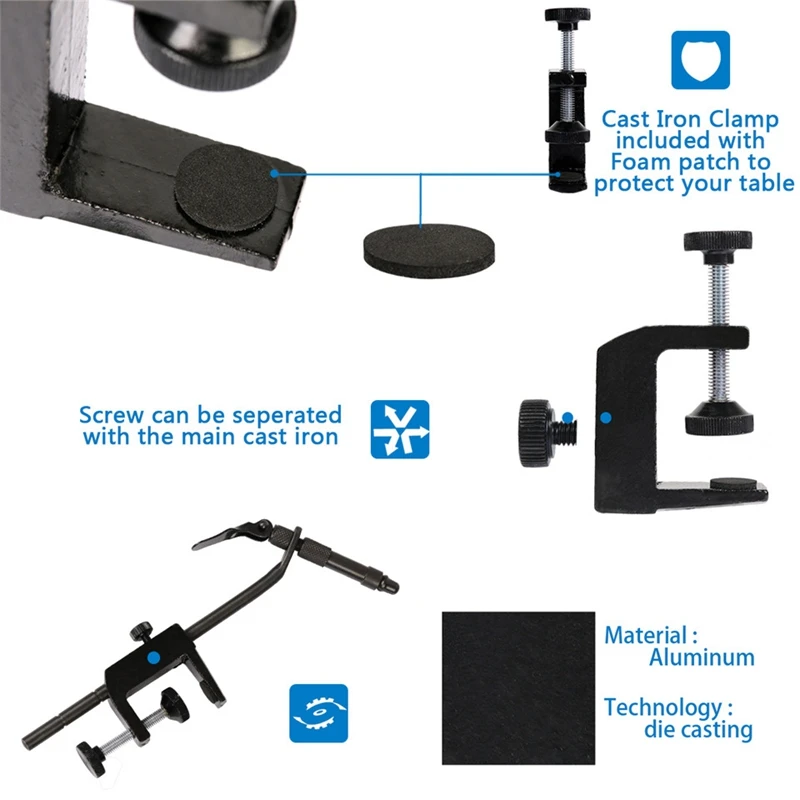 Сверхмощный чугунный зажим крепится к краю стола.