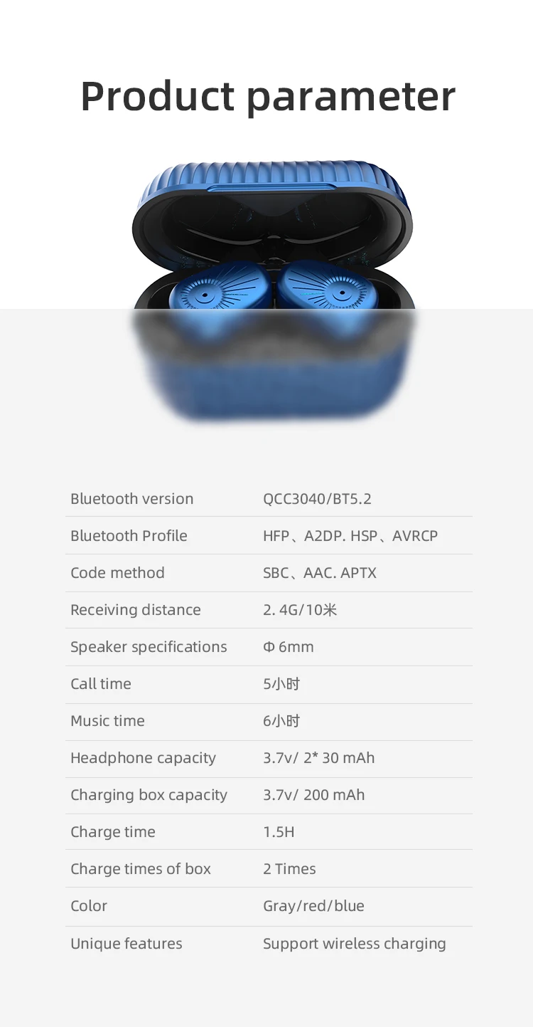 Модель Bluetooth: QCC3040 (низкое потребление, более стабильная) Версия Bluetooth: Bluetooth 5,2 (последняя версия) Метод декодирования: APTX, SBC, AAC Дальность передачи: ≤ 20 м Время разговора наушников: 6 ч Время прослушивания наушников: 7 ч Емкость аккумулятора наушников: 40 мА · ч Зарядное устройство Емкость аккумулятора: 200 мА · ч (зарядное устройство может заряжать гарнитуру дважды) 1. Последняя версия Bluetooth 5,2 делает гарнитуру более стабильной и более длинной в использовании. 2. Поддержка аудио декодирования APTX, качество звука более идеальное. 3. CVC8.0 интеллектуальное шумоподавление вызова, вызов более четкий. 4. Автоматическое Сопряжение и подключение 5. Интеллектуальная работа сенсорного типа более удобна. 6. IPX4 водонепроницаемый, больше подходит для спорта
