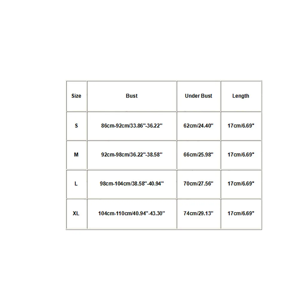 Размер Бюст Под грудью Длина S 86 см-92 см/33,86 ''-36,22'' 62 см/24,40'' 17 см/6,69'' М 92 см-98 см/36,22 ''-38,58'' 66 см/25,98'' 17 см/6,69'' L 98 см-104 см/38,58 ''-40,94'' 70 см/27,56'' 17 см/6,69'' XL 104 см-110 см/40,94 ''-43,30'' 74 см/29,13'' 17 см/6,69''