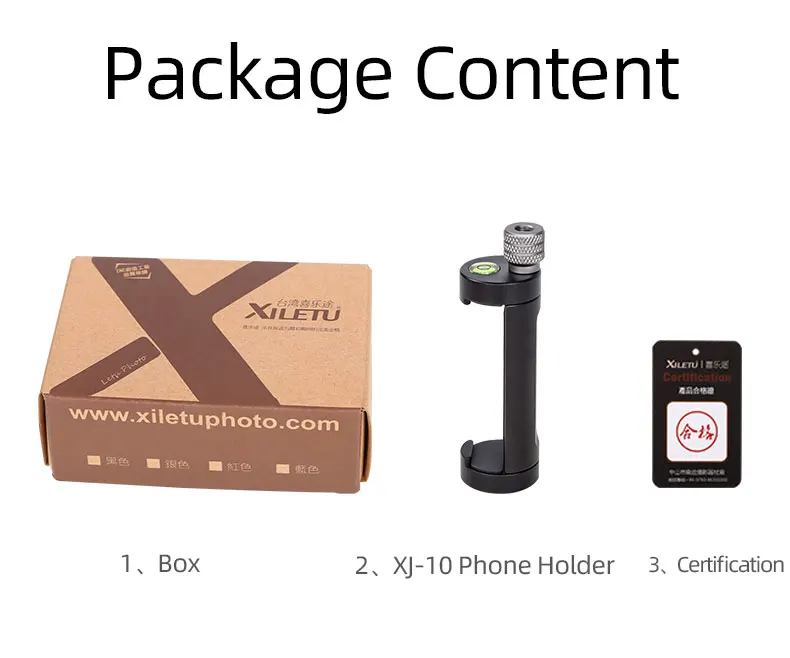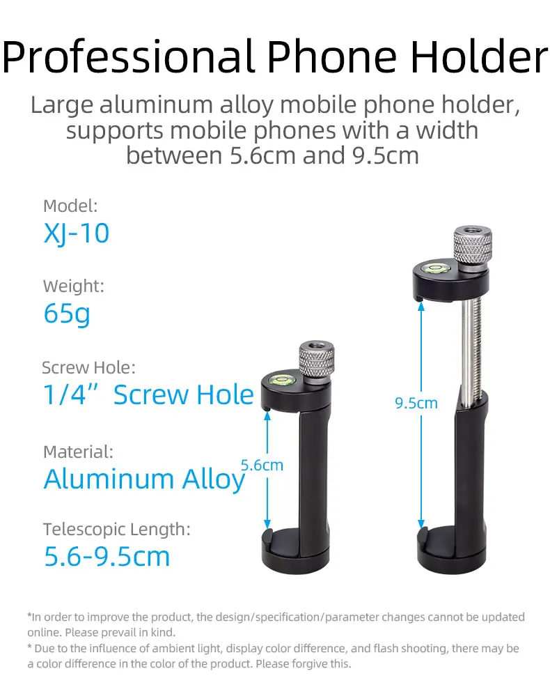 Бренд: XILETU Модель: XJ-10 Зажим для телефона Материал: алюминиевый сплав Вес: 65 г Телескопическая длина: 5,6 ~ 9,5 см (2,2 ~ 3,74 дюймов)