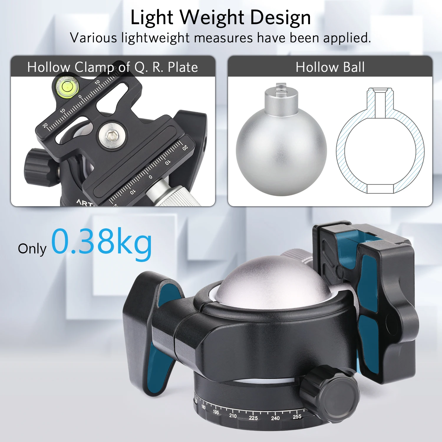 [Отличный легкий дизайн] его шар принимает передовые полимерные материалы, вместе с полым зажимом быстроразъемной пластины, его вес всего 0,38 кг/0,84 фунта, намного легче, чем у других аналогичных продуктов.