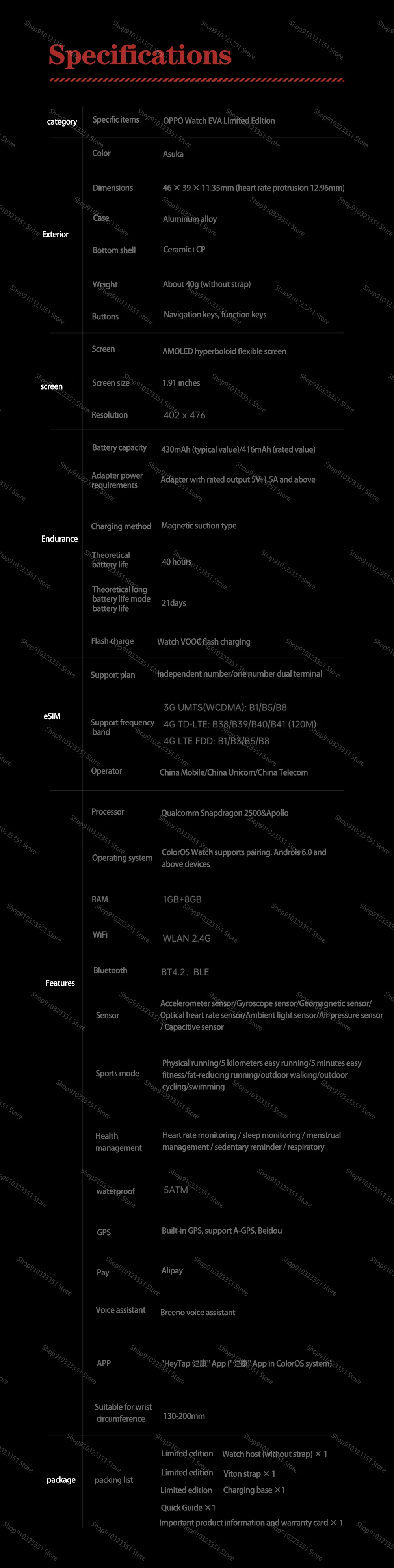 Q: это глобальная версия? О: Нет, это китайская версия, eSim и NFC не могут использоваться В: оригинальные часы OPPO? О: Да, конечно, Новое поступление 24 марта 2020, как OPPO временно не открывать часы марки, пожалуйста, подождите, пока Aliexpress обновления В: Могу ли я использовать его для совершения вызова, ответа на вызов и чтения уведомлений? О: Да, совершайте звонки и отвечайте на вызовы, Читайте информацию, Поддерживайте телефонные смс (Следуйте системному языку) и часть приложения В: у меня нет телефона oppo, могу ли я его купить? О: Да, он работает с любым устройством на базе android 6,0 и выше В: можем ли мы работать в моей стране? О: сейчас нет, только сейчас работаем в Китае В: если нет сети eSim, как мне звонить, ответить на вызов и прочитать уведомления? О: Нет необходимости в сети, просто подключите Bluetooth В: Могу ли я использовать другие языки, такие как русский, испанский? Ответ: нет сейчас, только в том случае, Поддержка на китайском и английском языках, если OPPO планируется распродажа, глобальная версия, она может Поддержка несколько языков В: какая операционная система часов? О: ColorOS на базе Android В: Могу ли я скачать английские приложения, такие как Facebook,Twitter,What's app? О: Не сейчас, все приложения должны быть переразработаны oppo, изменяя архитектуру, планировку и режим взаимодействия, подходящий для часов В: что еще делать с часами? О: звоните, звоните, читайте сообщение. В настоящее время этот продукт поддерживает английский и китайский языки, но в магазине приложений имеется только китайское приложение. Но системное программное обеспечение поддерживает английский язык, например, плавание, бег, езда на велосипеде, ходьбу, сердечный ритм, здоровье и другие встроенные приложения, eSim сейчас поддерживает только Китай. Больше функций и программного обеспечения необходимо ждать разработки OPPO. Продавец не предоставляет никакой гарантии